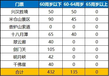 2. 门票补差(随团费一同支付):60周岁以下+432元/人,60-64周岁以下+135元/人(费用明细详见下列表格);
