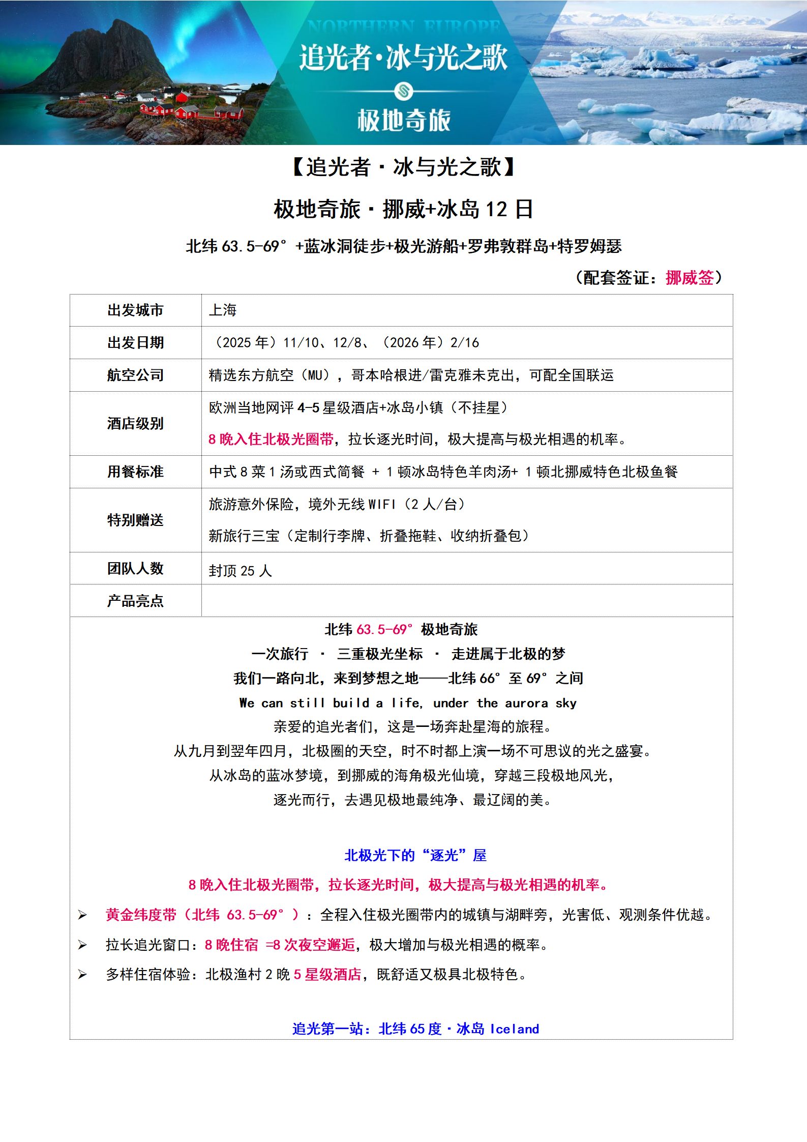 • 【11-12月+26年春节】【追光者·冰与光之歌】挪威+冰岛12日-北纬63.5-69°+蓝冰洞+极光游船+罗弗敦群岛+特罗姆瑟