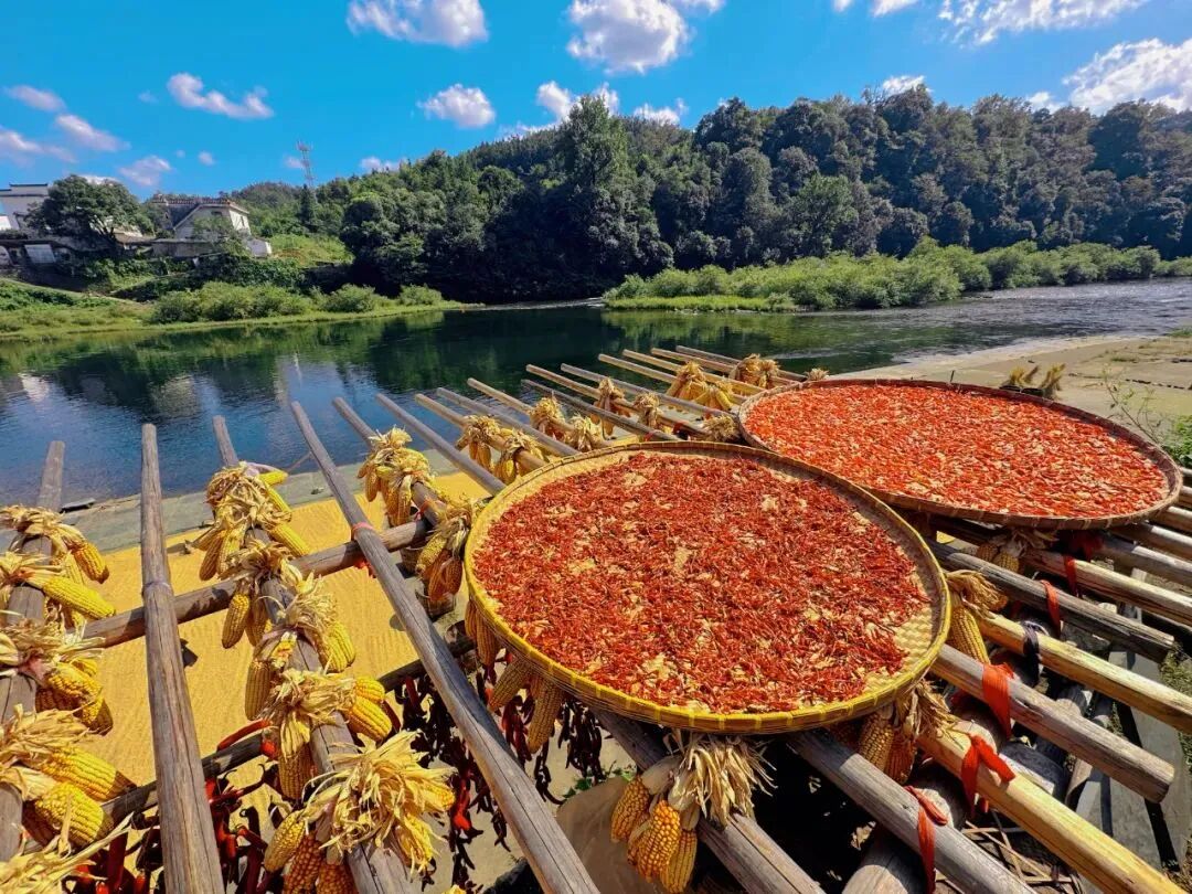 徽式商铺林立,前店后坊,一幅流动的缩写版“清明上河图”。家家户户屋顶晒盘云集,绘就出一幅“晒秋人家”风情画。