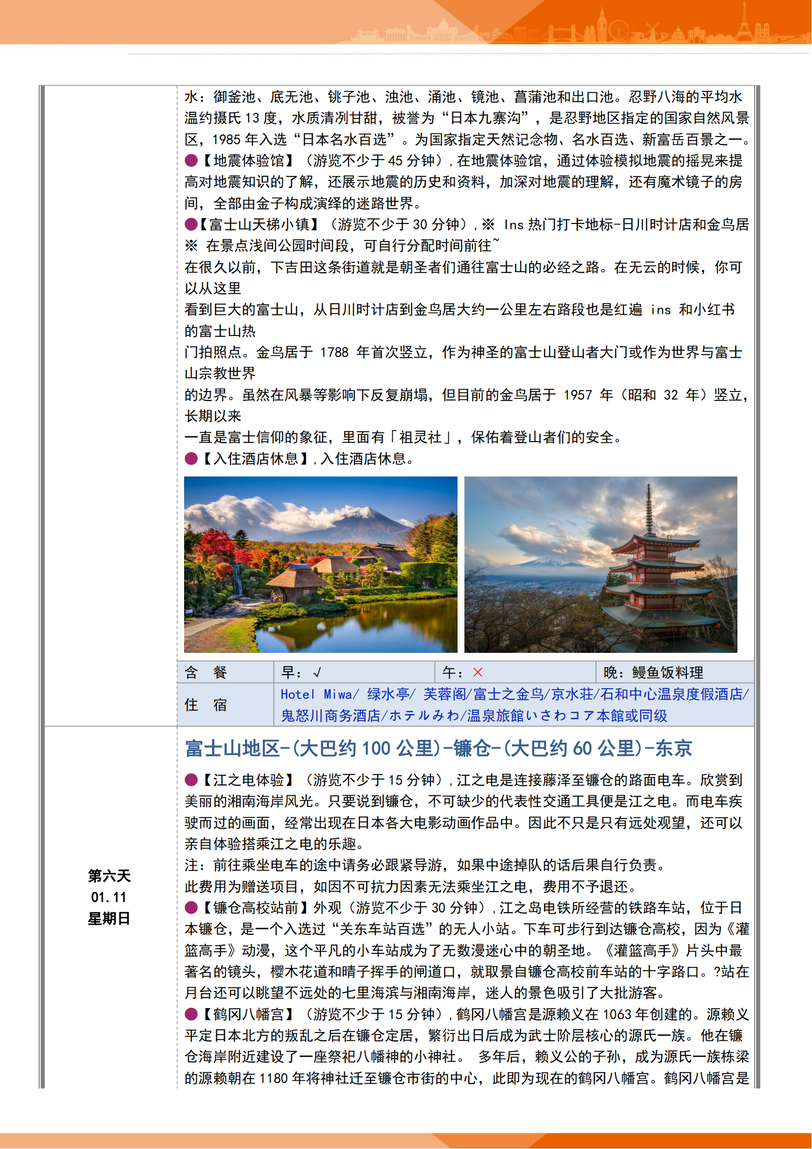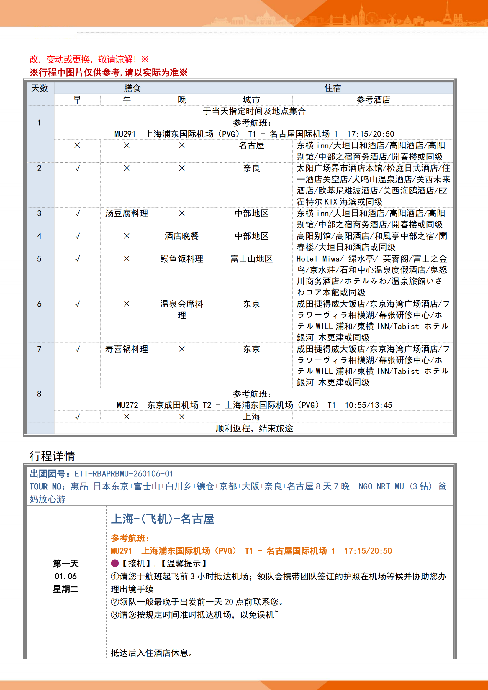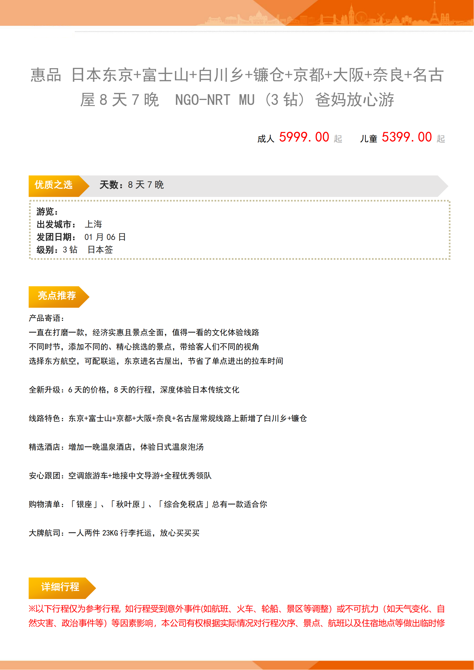 【1-3月-东航名进东出】3钻惠品 爸妈放心游-日本 东京+富士山+白川乡+镰仓+京都+大阪+奈良+名古屋 7晚8日 FJY