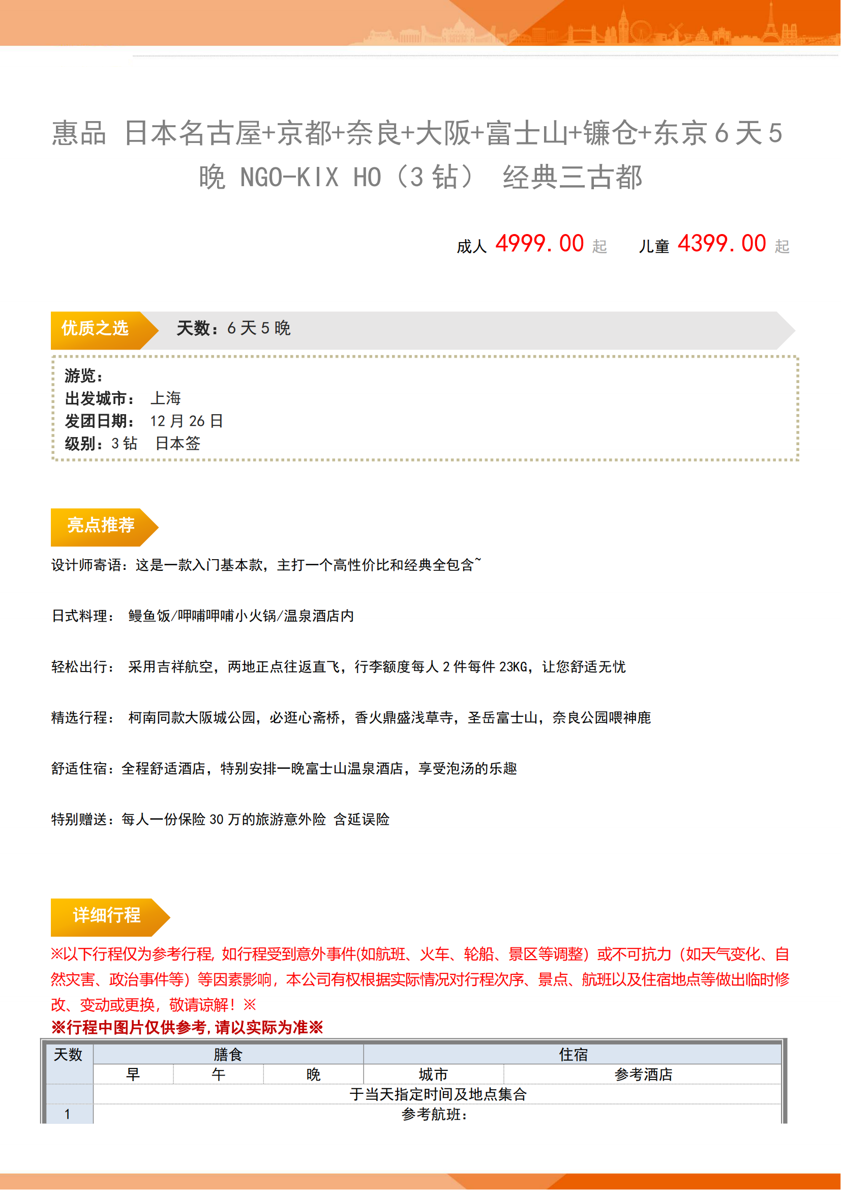 【12-3月】3钻惠品 经典三古都-日本 名古屋+京都+奈良+大阪+富士山+镰仓+东京 5晚6 日 FJY
