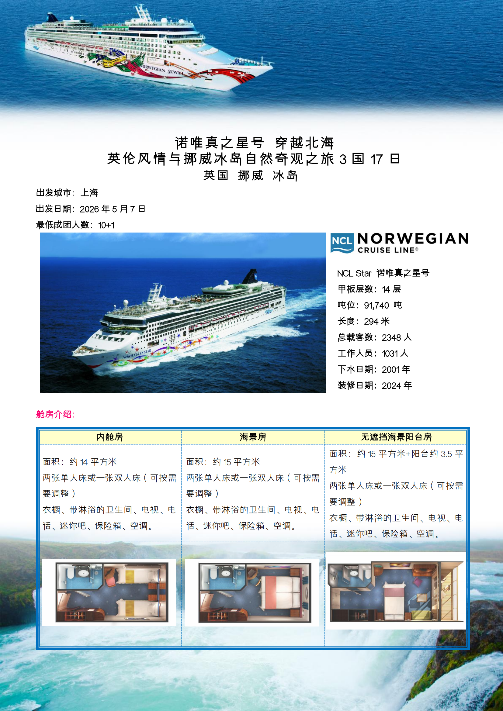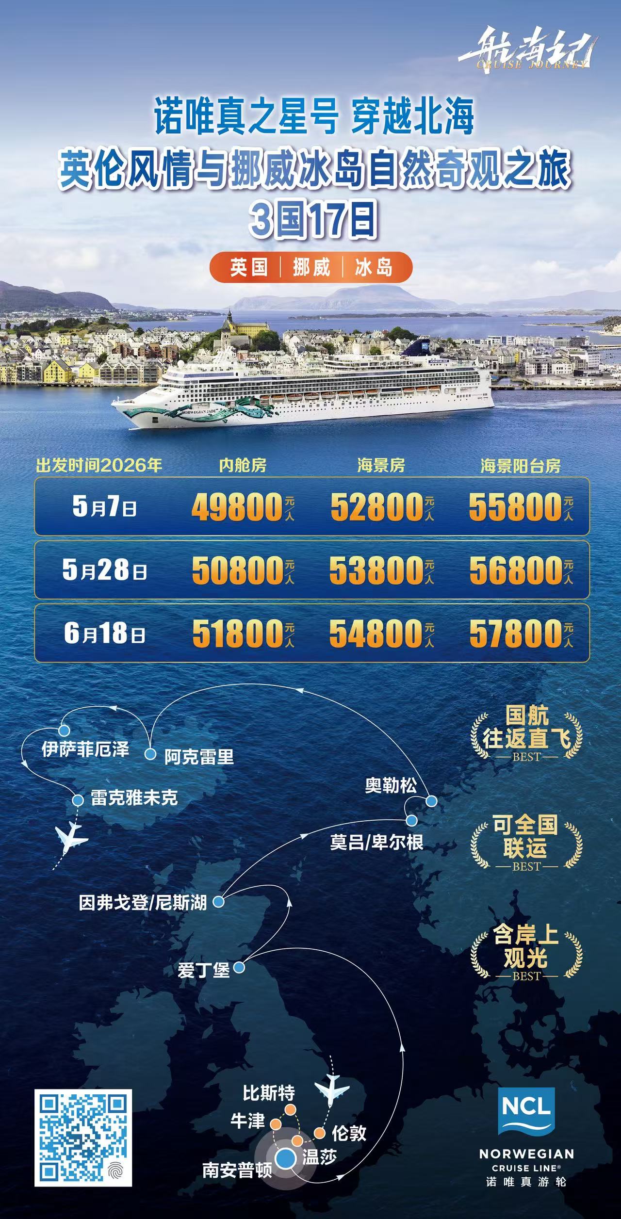【2026年5-6月诺唯真之星号】挪威冰岛自然奇观+穿越北海英伦风情 3国17日(挪威 冰岛 英国)SW