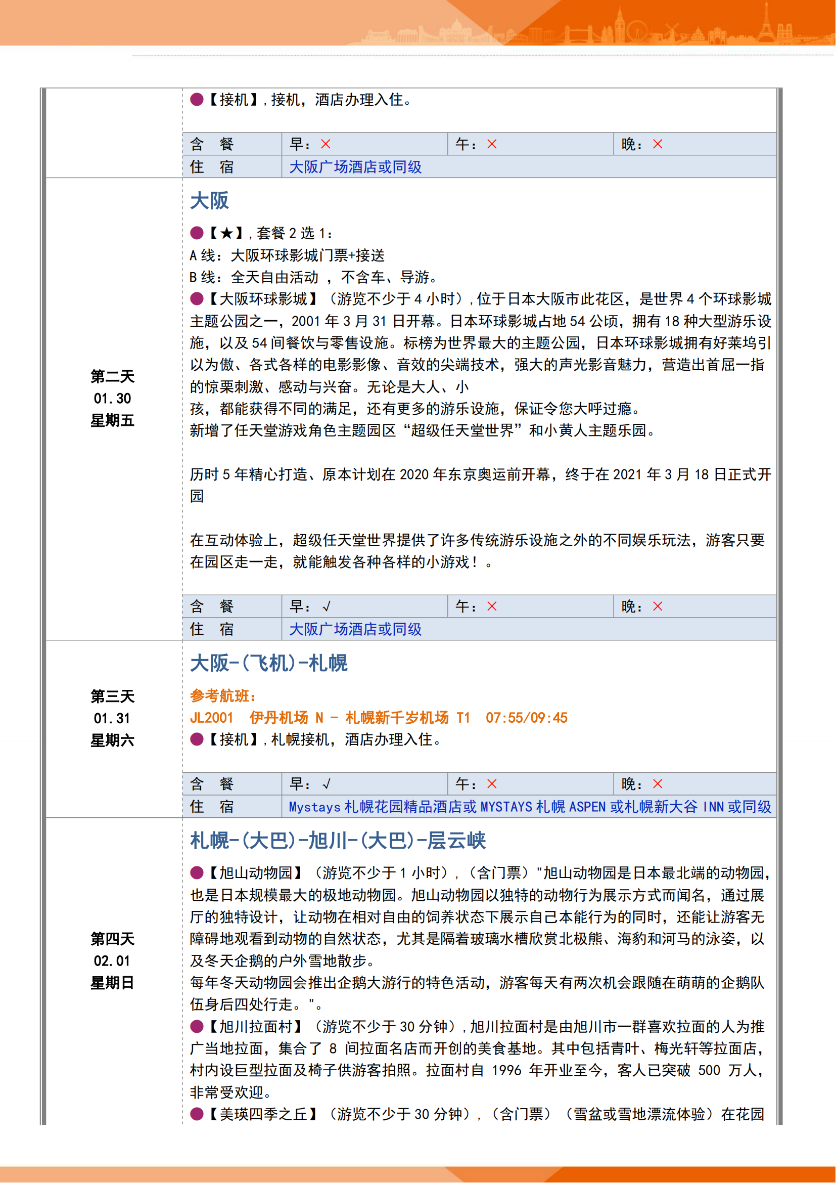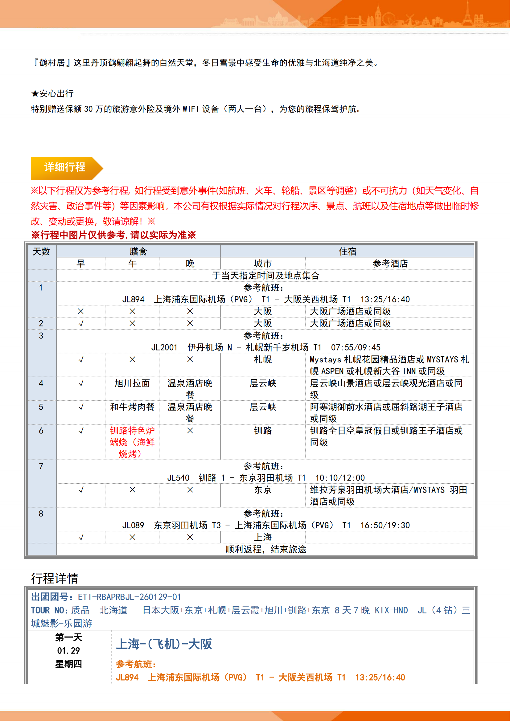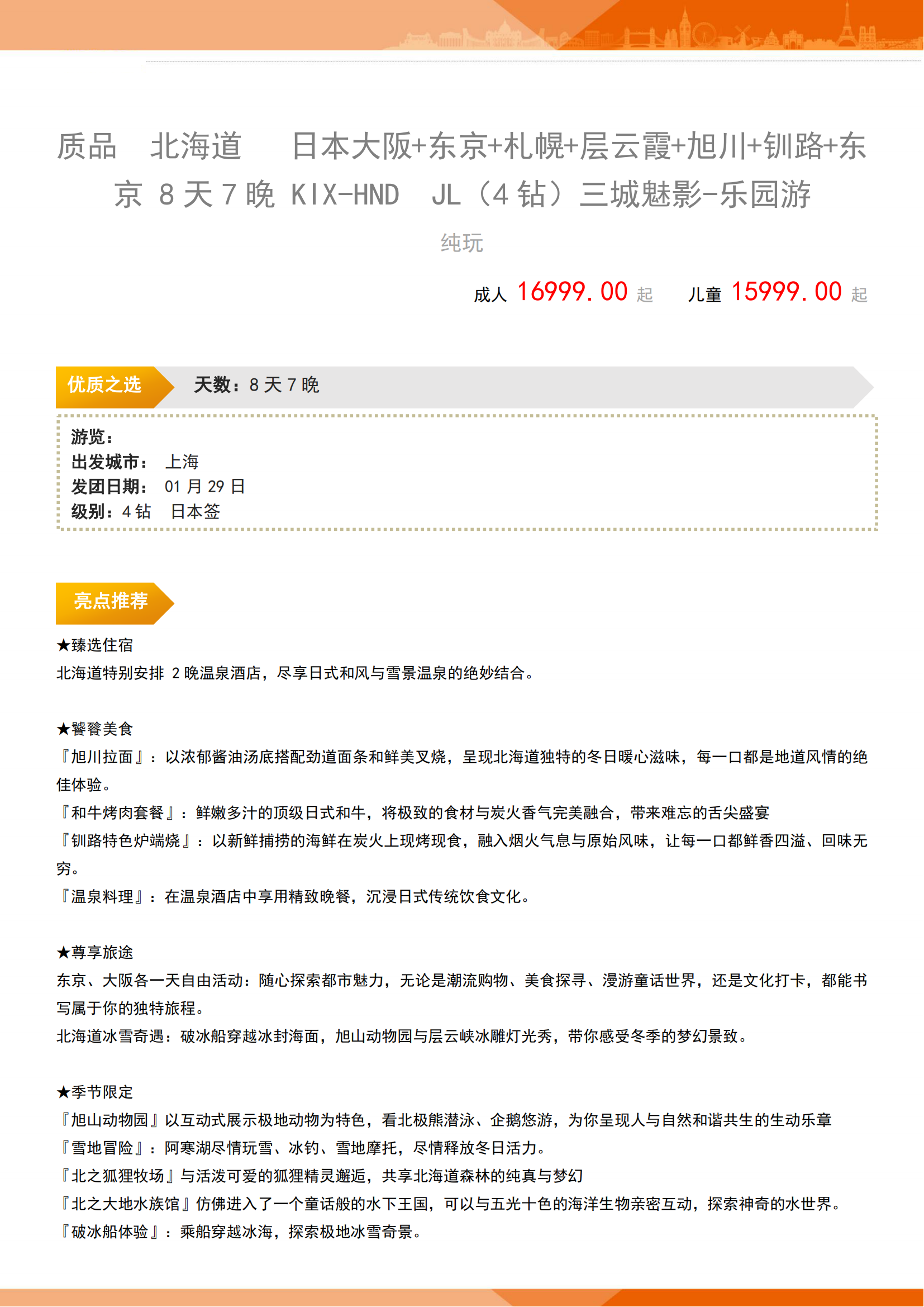 【1-2月】4钻质品 三城魅影 乐园游-日本 北海道+大阪 东京 7晚8日-札幌+层云霞+旭川+钏路 FJY