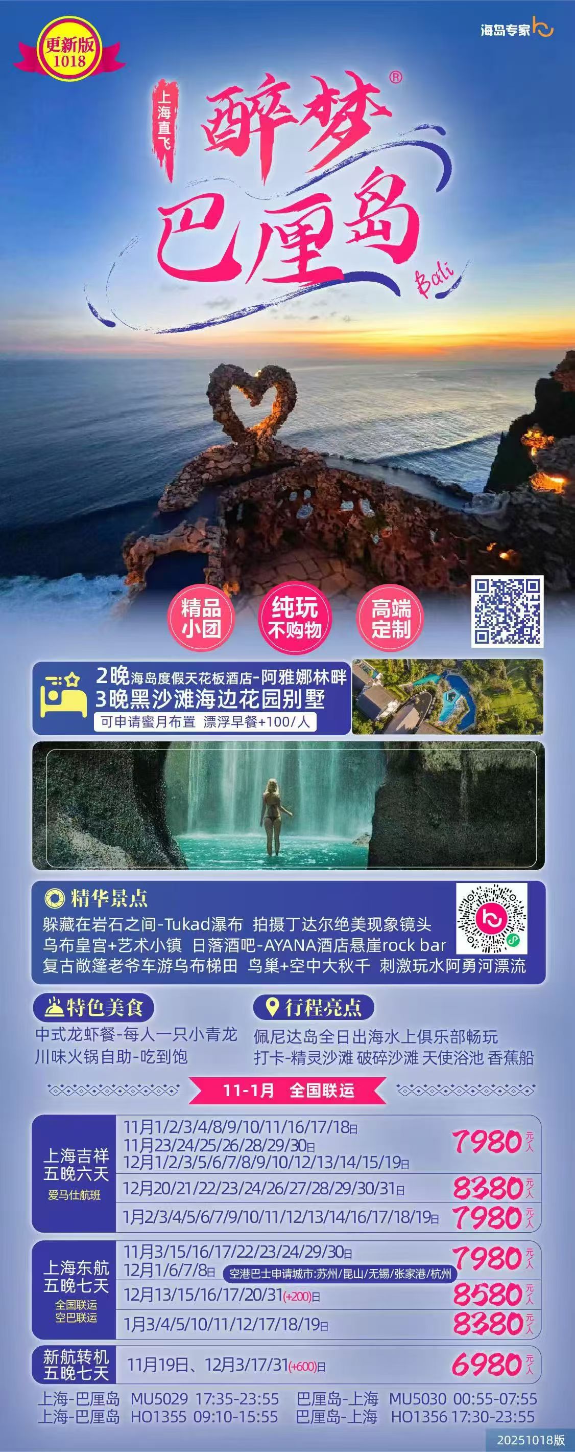 【11-1月-吉祥航空】醉梦-巴厘岛 纯玩 5晚6日-2晚阿雅娜林畔酒店+3晚黑沙滩海边花园别墅 ZW