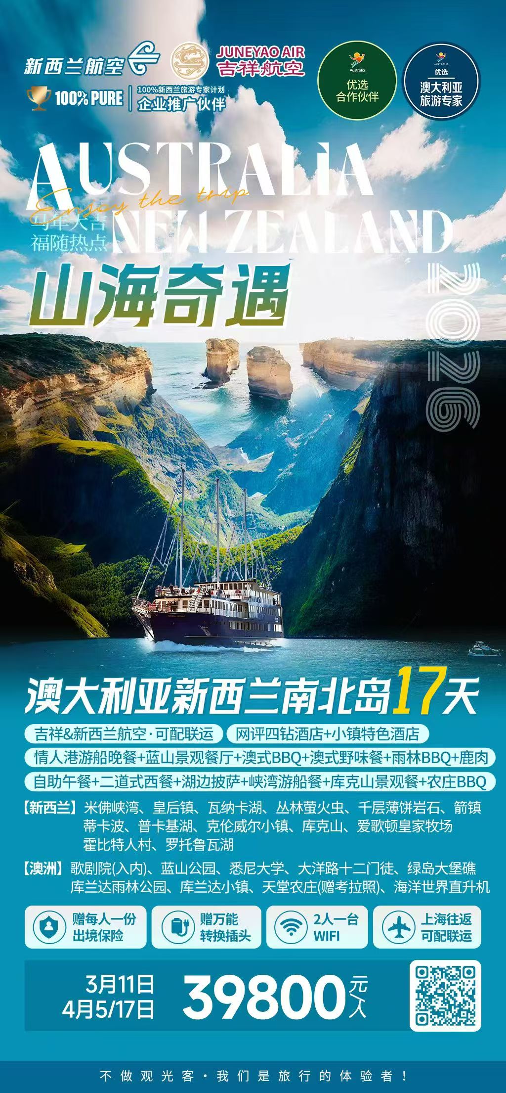 费用包含: 1、团队经济舱机票费用 2、澳大利亚团队签证费用 3、全程当地四星+小镇特色酒店 4、酒店住宿以两人一室、自由组合为原则。如出现自然单间,我公司领队将在同性游客房内加床;如遇“单男单女”情况,将拆换夫妻用房或者调整为三人房(或加床),请游客谅解!如需安排单人房,请于出境前支付单人房差额并取得本公司的确认 5、全程中文领队服务,行程中中文司机兼导游服务 6、团队行程期间的空调巴士接送费用 7、行程中标注包含的景点首道门票费用 8、酒店早餐(遇早航班为打包饭盒),中式午晚餐(8菜1汤,澳大利亚餐标AUD30/人,新西兰餐标NZD30/人,10-12人一桌)、及西式(自助餐)、澳大利亚简餐餐标20-25澳币、新西兰段简餐餐标20-25纽币。用餐时间在飞机上或船上以机船餐为准,不再另退餐费; 9、旅行社责任险+旅游意外险。 | 费用不包含: 1、护照制证费用 2、行程中未提起的其他付费项目 3、单房差费用。12周岁以下小孩不占床,不占床小孩不含早餐。如要求占床而因此产生的额外单房差自理。