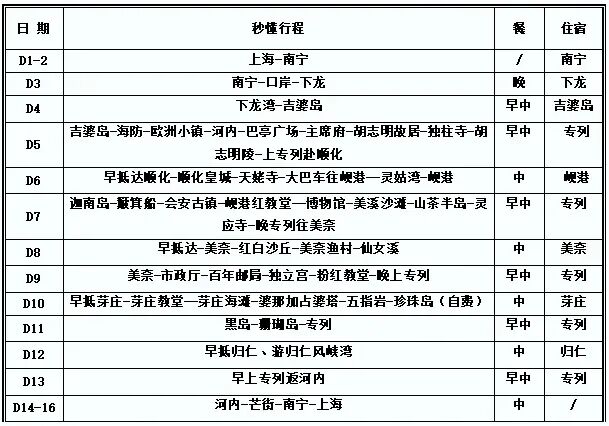 备注:(以上出发时间为上海出发时间,报价为上海起止,含上海-南宁往返火车硬卧,提前 20天报名优先安排中下铺。);越南当地空调专列硬卧、软卧。不含越南签证费加杂费 680 元/人,报名时随团费一起付清)