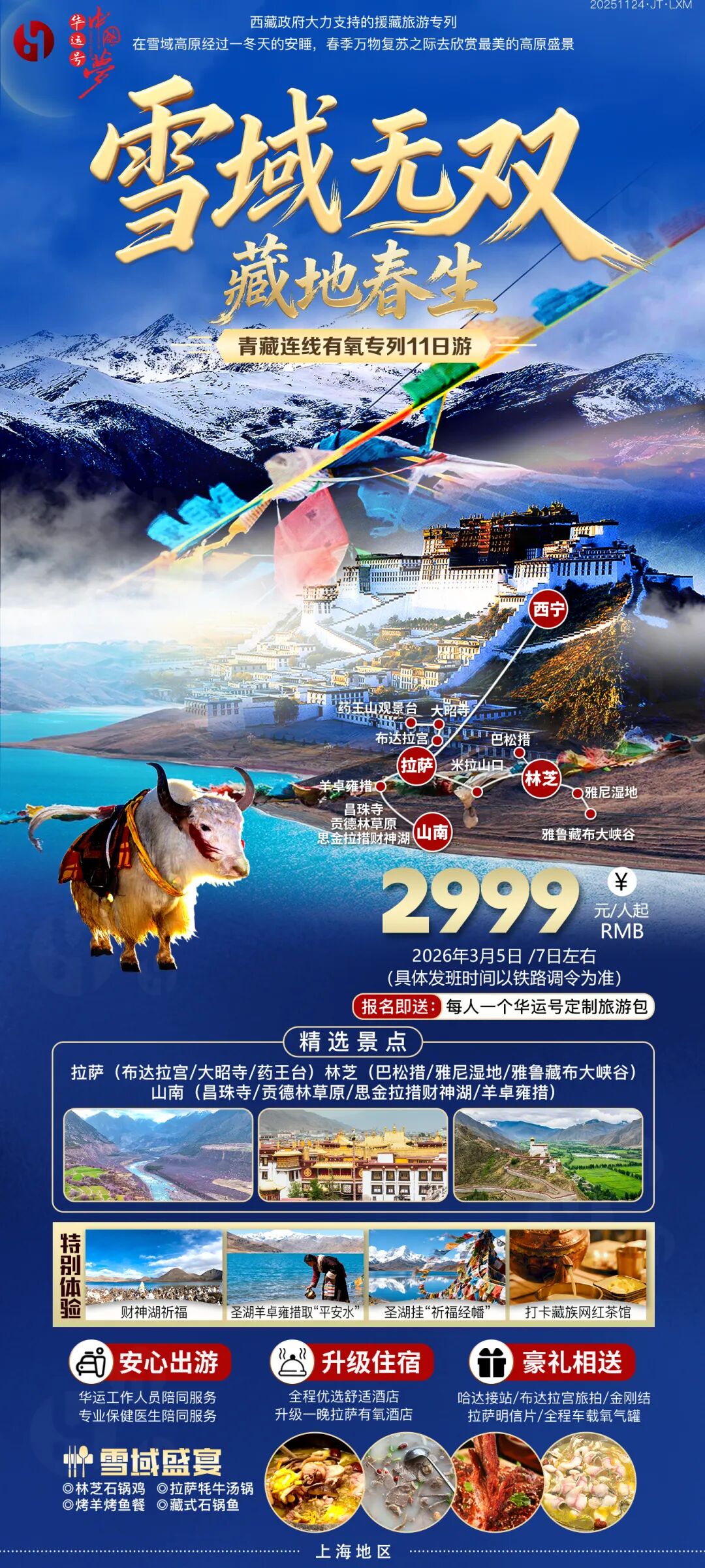 3、【交通】:上海往返西宁正班火车硬卧(正班车段为实名制随机出票,不保证同行关系及铺位,敬请谅解!),西宁—拉萨往返空调有氧专列;当地旅游大巴车。
