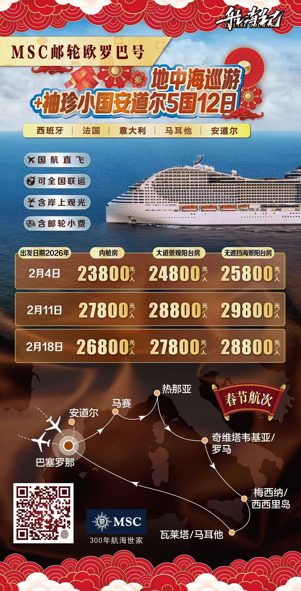 【2026年2月MSC邮轮欧罗巴号】地中海巡游+袖珍小国安道尔5国12日(西班牙+法国+意大利+马耳他+安道尔+含岸上观光和邮轮小费)SW