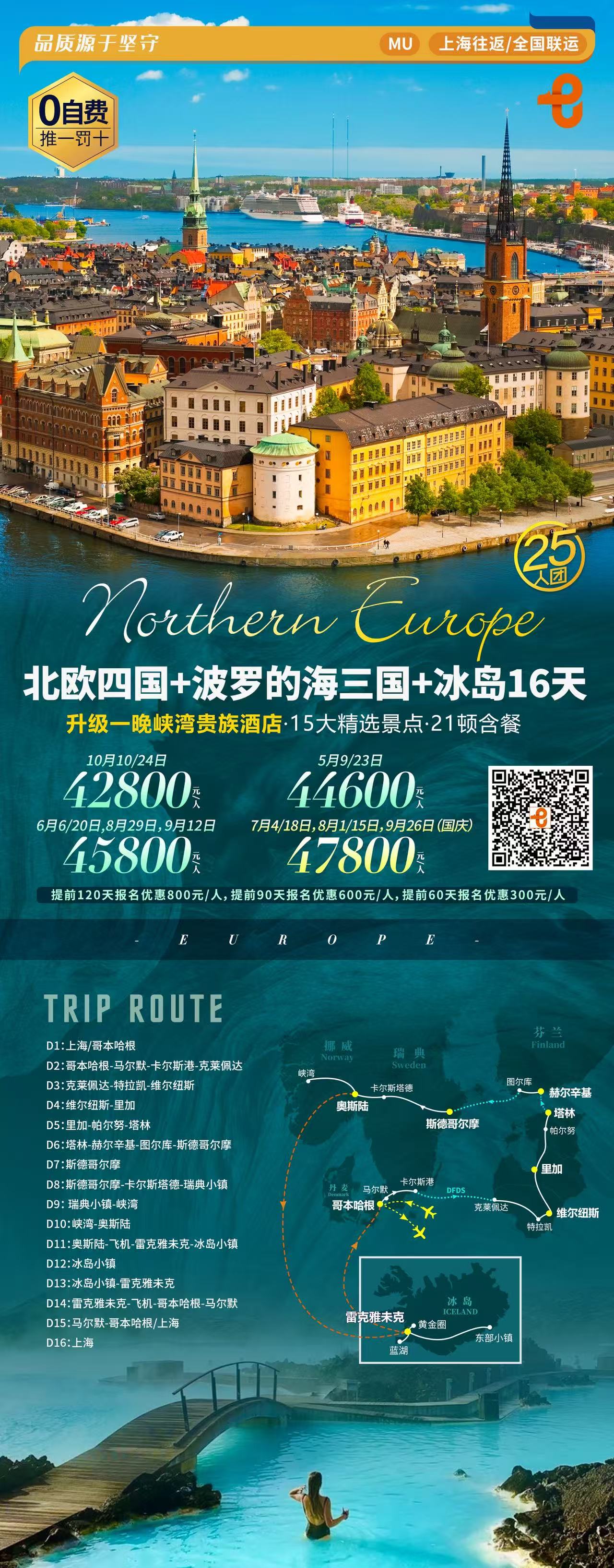 【5-10月】4钻质品-北欧四国+波罗的海三国+冰岛 14晚16日-挪威 瑞典 丹麦 芬兰+爱沙尼亚 拉脱维亚 立陶宛 FJY
