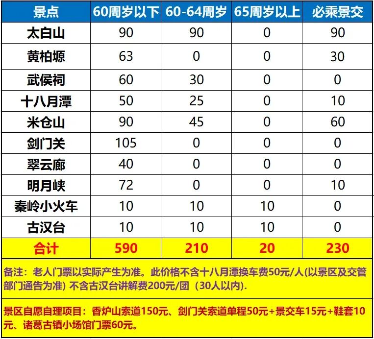 3. 门票补差&必乘景交(随团费一同支付):60周岁以下+819元/人,60-64周岁以下+439元/人,65周岁以上+249元/人(费用明细详见下列表格);