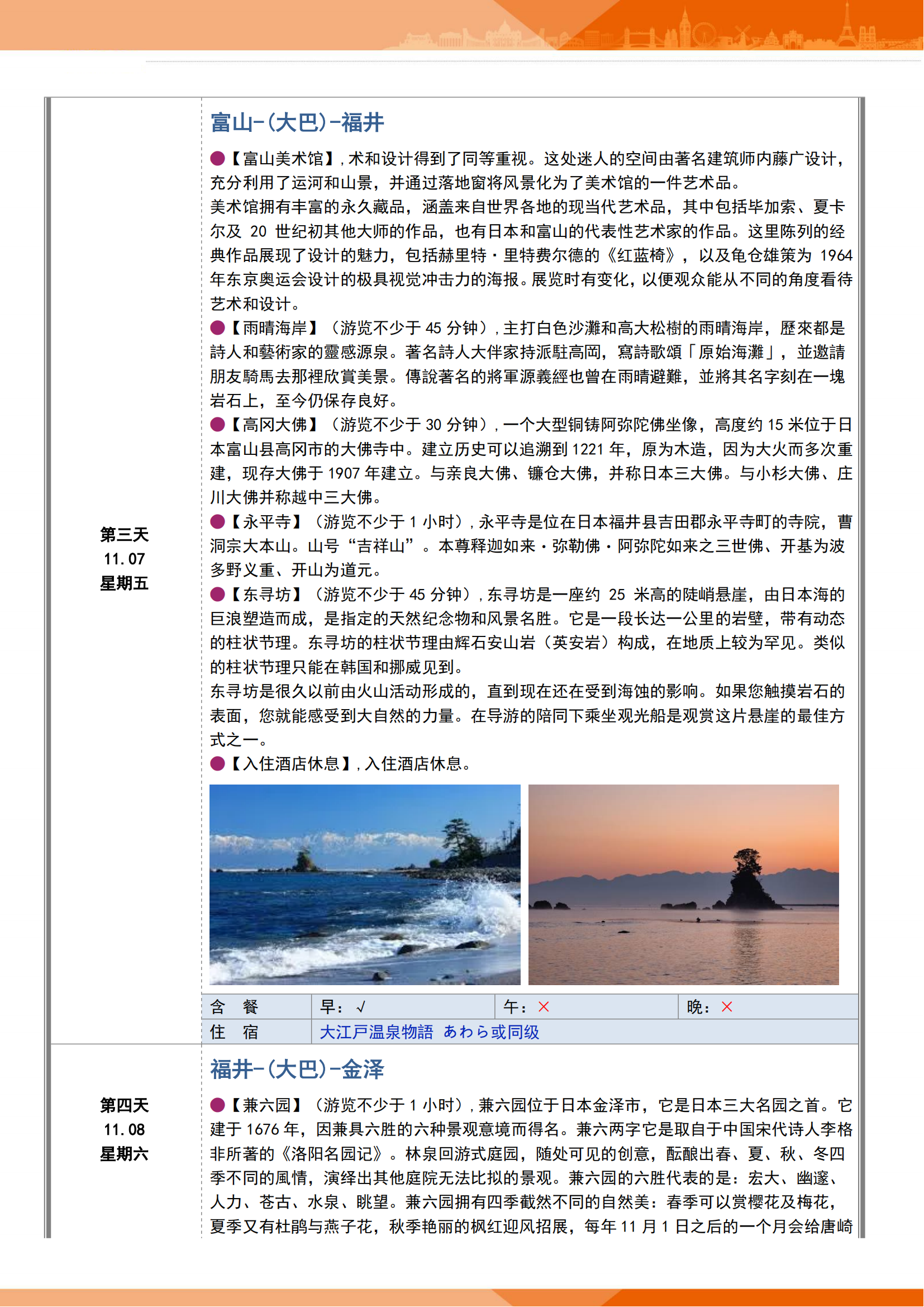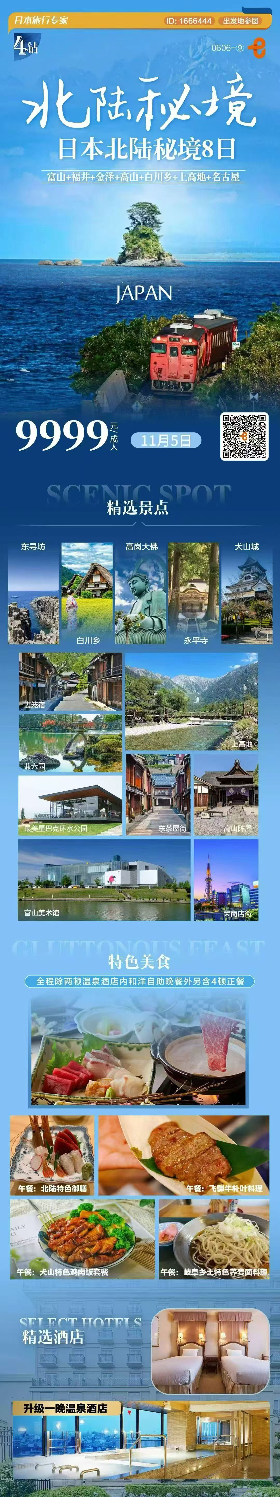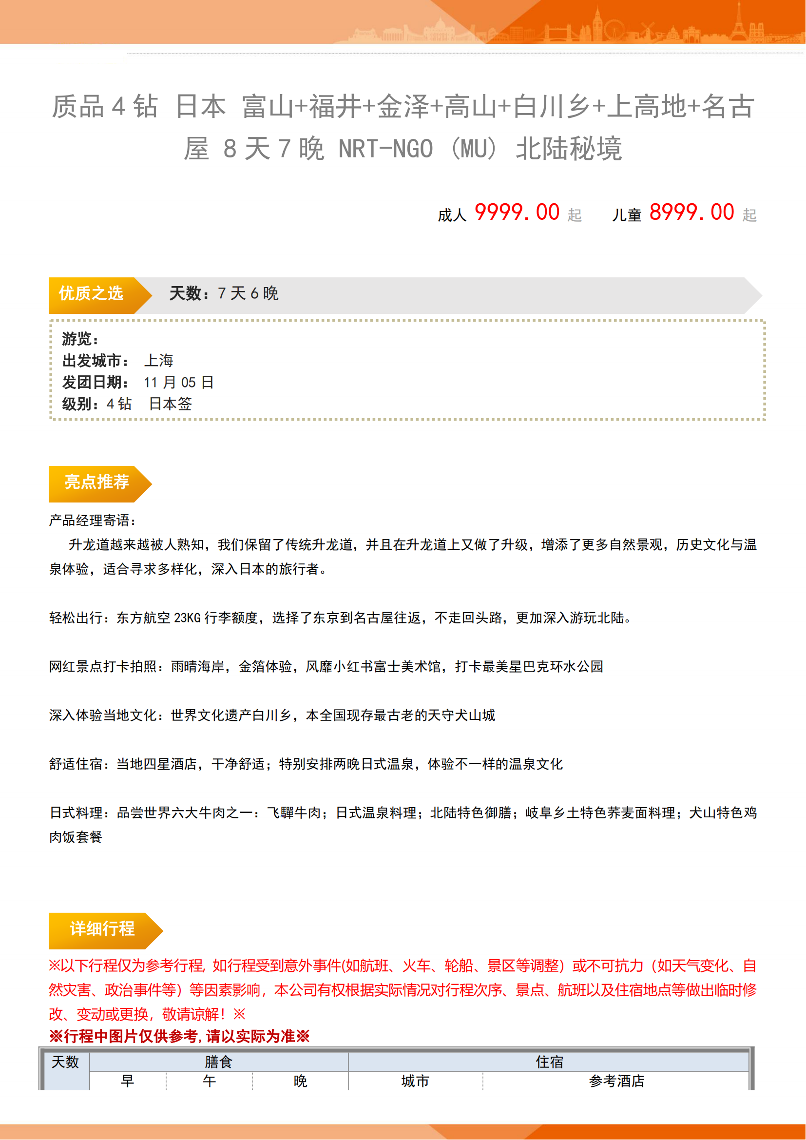 【11月5日】4钻质品 北陆秘境-日本 富山+福井+金泽+高山+白川乡+上高地+名古屋 7晚8日 FJY