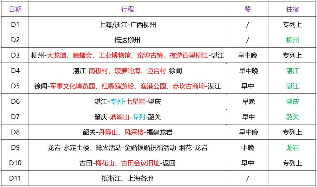广西柳州(大龙潭、嘻螺会、工业博物馆、窑埠古镇、夜游百里柳江)、广东湛江(南极村、菠萝的海、迈合村、军事文化博览园、红嘴鸥游船、渔港公园、赤坎古商埠)、肇庆(七星岩、鼎湖山)、韶关(丹霞山、风采楼)、福建龙岩(永定土楼、梅花山、古田会议会址)全软卧空调专列11日(全程纯玩0购物、0自费) 产品报价 常规A团:全程纯玩0购物、0自费,6晚商务酒店,餐标30元。如升级为2人间+2200元/人 。 软卧上铺:4180 软卧下铺:4780 常规B团:全程纯玩0购物、0自费,6晚网评4钻,餐标40元。如升级为2人间+2200元/人。 软卧上铺:4980 软卧下铺:5580 备注:以上报价包含软卧专列铺位费、地面用餐、酒店标准间、空调大巴、导游服务等。不含门票+景交车,此费用根据不同年龄列车上交给导游。 70周岁以上:378元/人 65-69周岁:498元/人 60-64周岁:568元/人 60周岁以下:758元/人 儿童报价:6周岁-14岁(不含):2980元/人(不含酒店住宿及门票景交,含专列铺位半价票但不占铺、含车费、全餐费、司导服务费等)。 14周岁以上请按成人报价。6周岁以下儿童无法报名,敬请谅解! 分铺原则:1节车厢9个包间,共36位。1人报名安排上,2人安排1上1下,3人报名软卧尽量安排在一个包厢,但不承诺。 出发时间 2025年12月6日左右 (准确出发时间以铁路局命令为准) 报名时间:即日起,报满即止。 早鸟活动: 10月20日前报名缴费者。 1、赠送每人一件海军衫,一套旅行背包、帽子。 2、常规A团升级2晚4钻酒店,品质B团升级2晚5钻酒店。 报名条件及注意事项 凡身心健康,乐观向上者均可报名,有严重高血压、心脏病、哮喘病等易突发疾病及传染病、精神疾病患者谢绝参加, 如有隐瞒病情者后果自负,且病情严重者我社有权劝退或终止合同。70 周岁以上需半年内体检报告,75 周岁以上需正常年龄的直系亲属陪同。 乘全软卧专列的优势 ★优势一 旅游专列更安全!游客出行更放心! ★1、专列人员构成简单(全部是40-80岁之间的游客,没有闲杂人员 ★2、出行目的相同(都是为了旅游,都具备长途旅行的健康身体); ★3、乘客来源地相同(您所在的车厢身边的乘客,都来自相同地方)。 ★优势二 旅游专列是铁路局特批专用于旅游的火车,它停靠指定车站,没有闲杂乘客上下车,人员和行李都更安全,车次的首字母是Y子打头。专列上人员构成:乘务员、乘警,导游和工作人员,另外我司配有1-2位医护人员,备常用药品 ★优势三 专列真正实现轻装旅游。长线旅游有很多行李,每到一地,所有行李都要搬上搬下,游览时还要带着大包小包,而乘专列就很轻松,整个旅途都是同一趟火车,每到一地,游览多久,专列就等候多久,游客可以带着轻便小包去游览或住宿,大件行李可以放在专列上。 全列为适合老化全新改造的软卧包厢,配备适老化设备和充电设备,全列仅504位。专列车厢里可以随意走动、围坐聊天、打牌、娱乐,躺在卧铺睡觉,全无颠簸之苦,更安全、舒适。 行程特色 1、柳州:探索百里柳江喀斯特山水画卷,夜游百里柳江,感受柳江夜生活。 2、湛江:中国大陆最南端“菠萝的海”,登军舰,摸大炮,感受祖国的强大。 3、肇庆:七星岩“岭南第一奇观”、鼎湖山天然氧吧。 4、韶关:丹霞山世界地质公园。 5、龙岩:永定土楼世界文化遗产,丰富多彩的特色活动。 6、不容错过的美食盛宴:全程5大特色餐。 其中常规A团餐标30元,品质B团餐标40元。 7、品质B团早鸟活动,赠送肇庆1晚5钻酒店。 8、品质B团早鸟活动,赠送韶关一晚5钻温泉酒店。 秒懂行程 详细参考行程:准确行程以铁路局调令为准,出团通知书在出发前3-5日发。 行程安排 1上海、浙江-广西柳州 各地火车站上车(上海松江、嘉兴、杭州、金华、上饶、鹰潭,具体时间、站点以铁路局通知为准),前往柳州。 用餐:无 住宿:专列上 2抵达柳州 晚上抵达柳州后,入住酒店休息。 用餐:无 住宿:柳州 3柳州-湛江 早餐后乘车前往 用餐:早中(嘻螺会门票含1正餐)晚 住宿:专列上 抵达湛江早餐后,乘车前往 【祖国大陆南端——南极村】,游览完毕后乘车前往中国长寿之乡——徐闻,一路观赏旖旎的热带风光,途中游览【菠萝的海】(丰收季节3-5、11-12 月份如遇已收割季节会影响观赏,恳请谅解,而满山的风车也是另一种风情,种植面积高达35万亩,一望无际的菠萝田地此起彼伏,大地曲线优美,蔓延到天边。菠萝园内一年四季色彩斑斓,与散落在田野里的小村庄和巨大的风车构成一幅独具魅力的热带生态农业画卷。当你踏进这片五彩斑斓的土地时候,就会被眼前“排上倒海”菠萝海包围了,令人心旷神怡、悠然自在。徐闻绝美景点众多,在摄影师的镜头下徐闻之美惊艳了全世界,也惊动央视中央电视台的第七频道派出专业团队,走进徐闻专题拍摄地… …【南极村】【南极村艺术家部落客栈】当地渔民利用珊瑚石建设起一批各具特色的民宿,吸引了一批国内外知名文艺界人士长住于此进行文艺创作与宣学,是一家以文创为主题,集文化艺术创作、渔村生活体验的文化旅游基地 ,观会唱歌的房子珊瑚屋,由于风从树叶间,从用珊瑚石砌成 的珊瑚墙的缝隙里涌了进院子,好像还颇有节奏和乐感,所以当地人把村子里的珊瑚屋当成了乡间民谣的歌者起名会唱歌的房,小渔村中人们日出而作日落而息乐观、淳朴、和善。世代居住于此的村民,以大海珊瑚石为家,珊瑚墙壁连成了一个珊瑚世界。先民们采用海中的珊瑚石作为建筑原料
