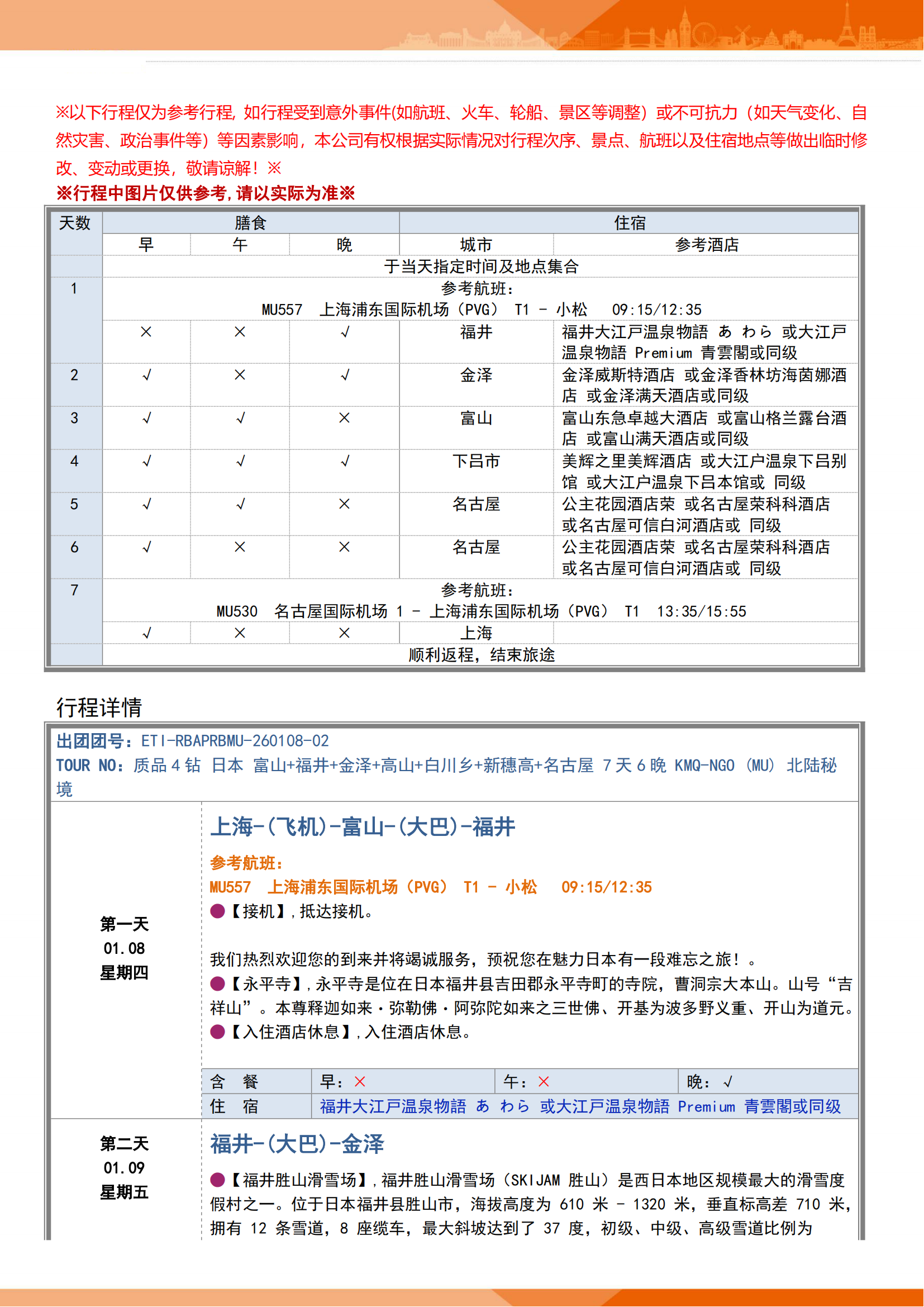 【1-2月-小松进名古屋出】北陆秘境 4钻质品 -日本 富山+福井+金泽+高山+白川乡+新穗高+名古屋 6晚7日 FJY
