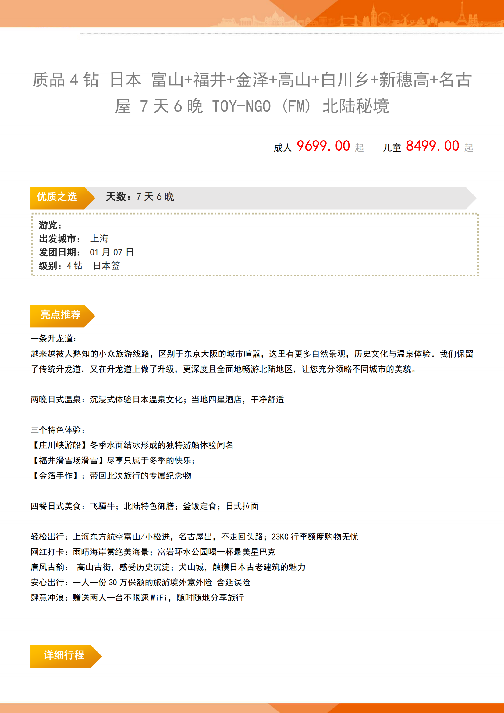 【1-2月-富山进名古屋出】北陆秘境 4 钻质品-日本 富山+福井+金泽+高山+白川乡+新穗高+名古屋 6晚7日 FJY