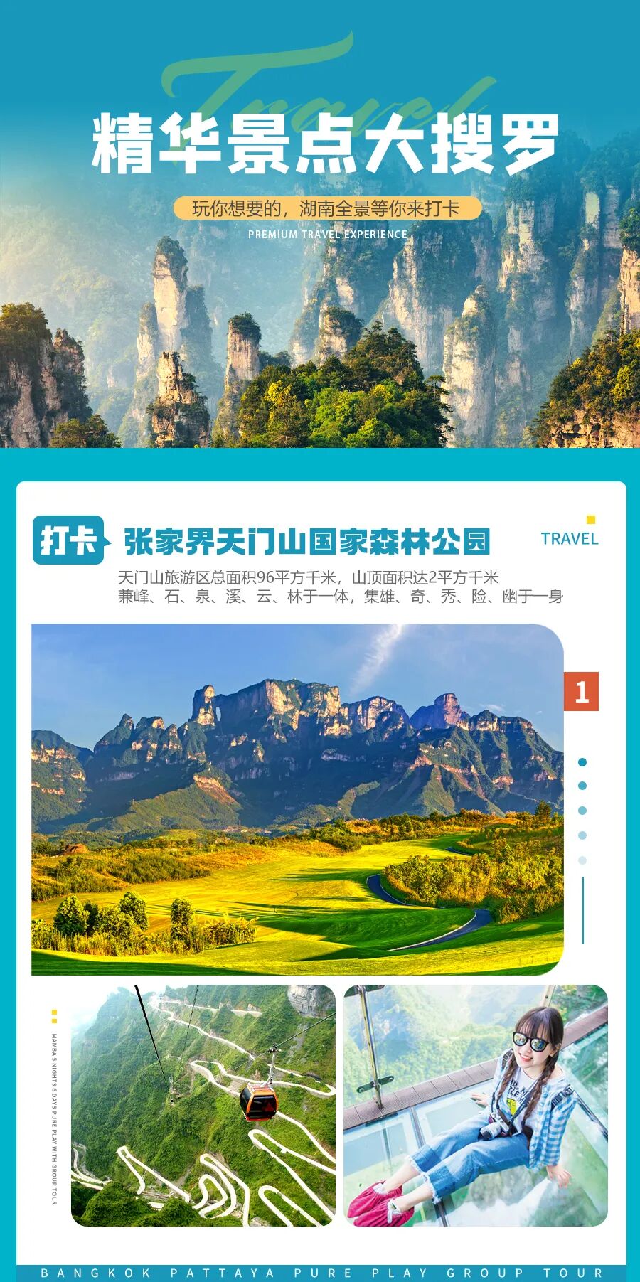 6.张家界景区旅游用车均为套车(同款车型,不一定是同一个司机,也就是全程不固定使用同一台车,请客人谅解!景区内乘坐景区环保车,非一团一车,所以游客多数时候无法保证整团客人同时抵达下一个目的地,请听从导游的安排;以上行程在不减少景点的前提下可以调整景点游览的先后顺序。