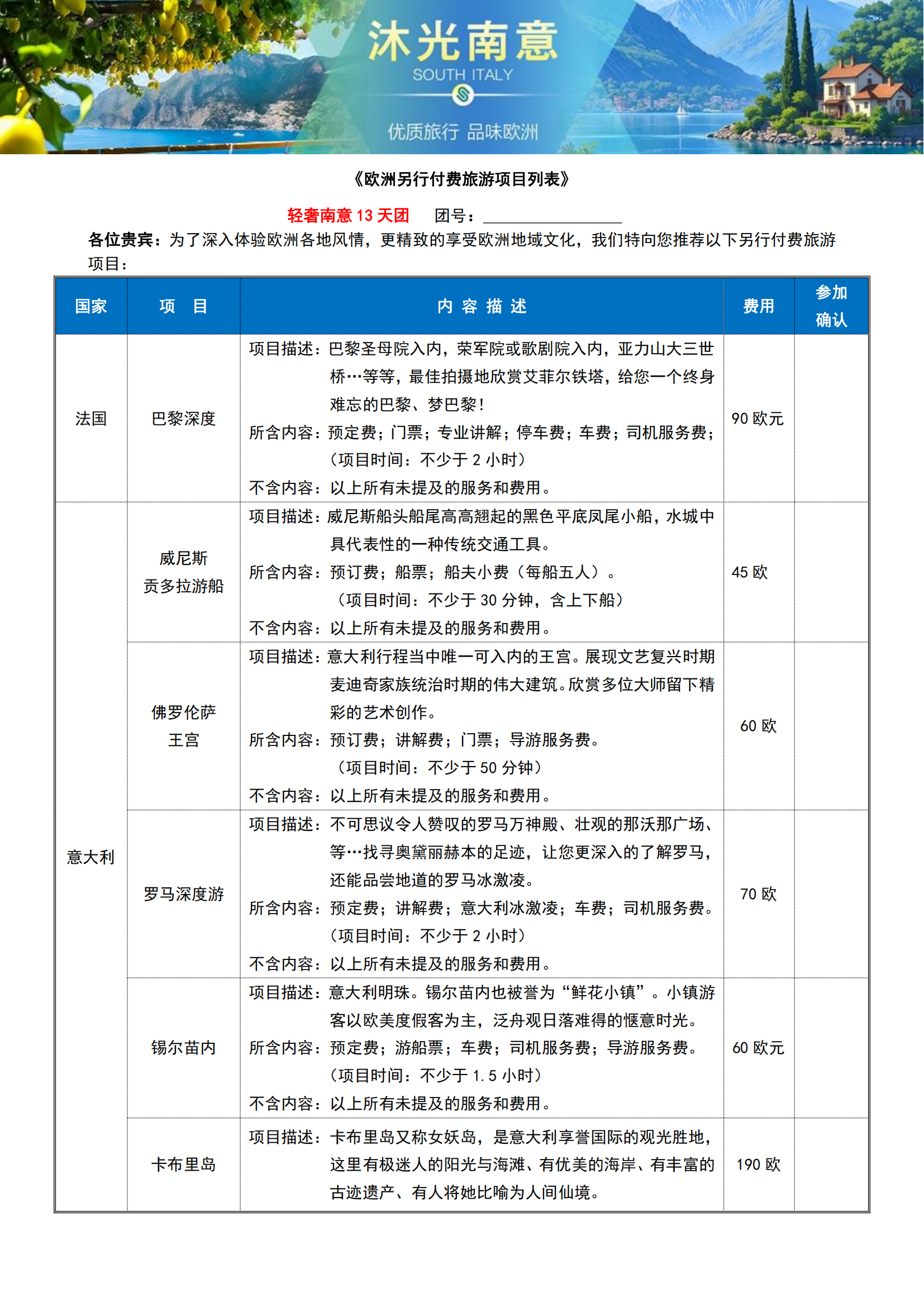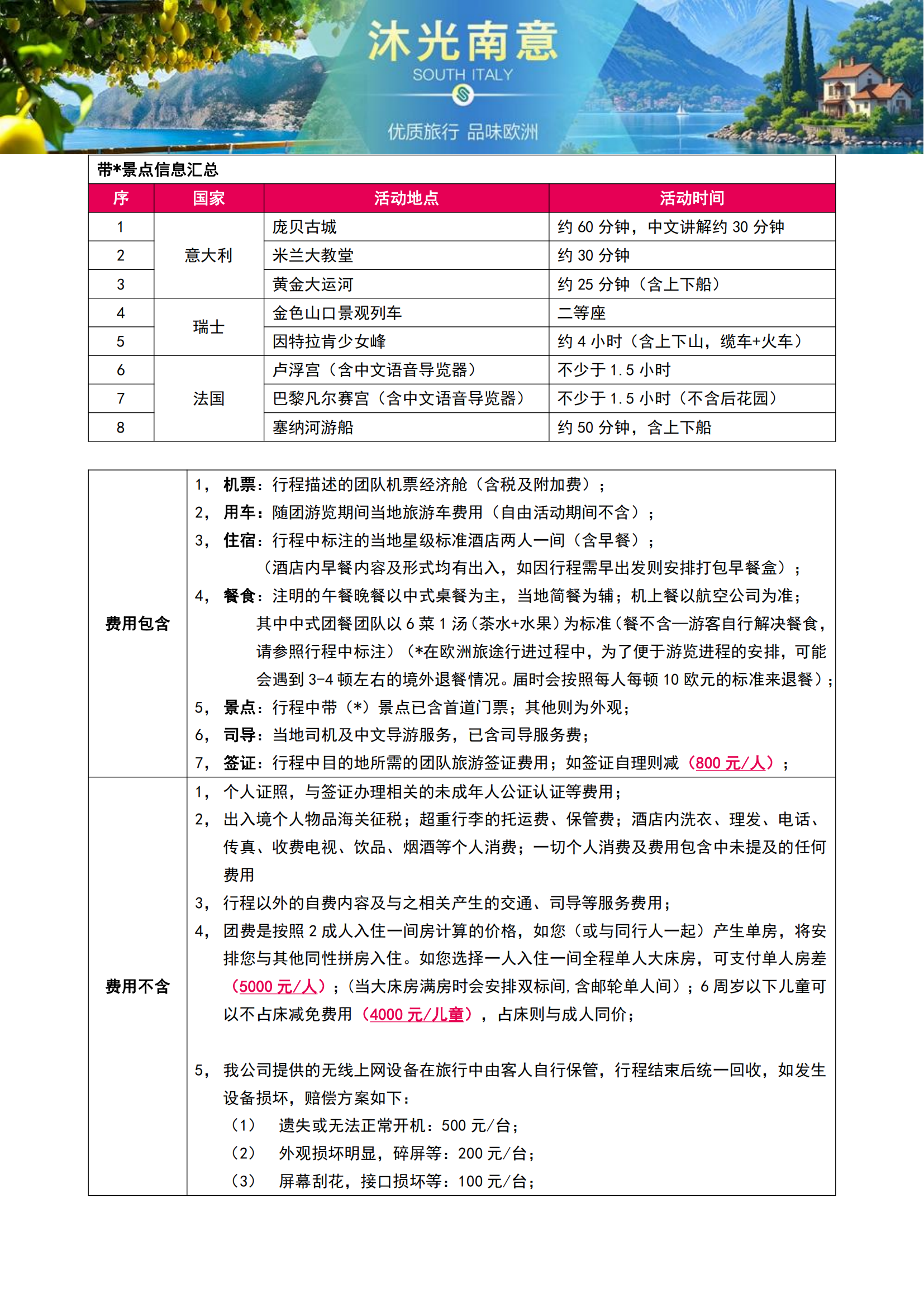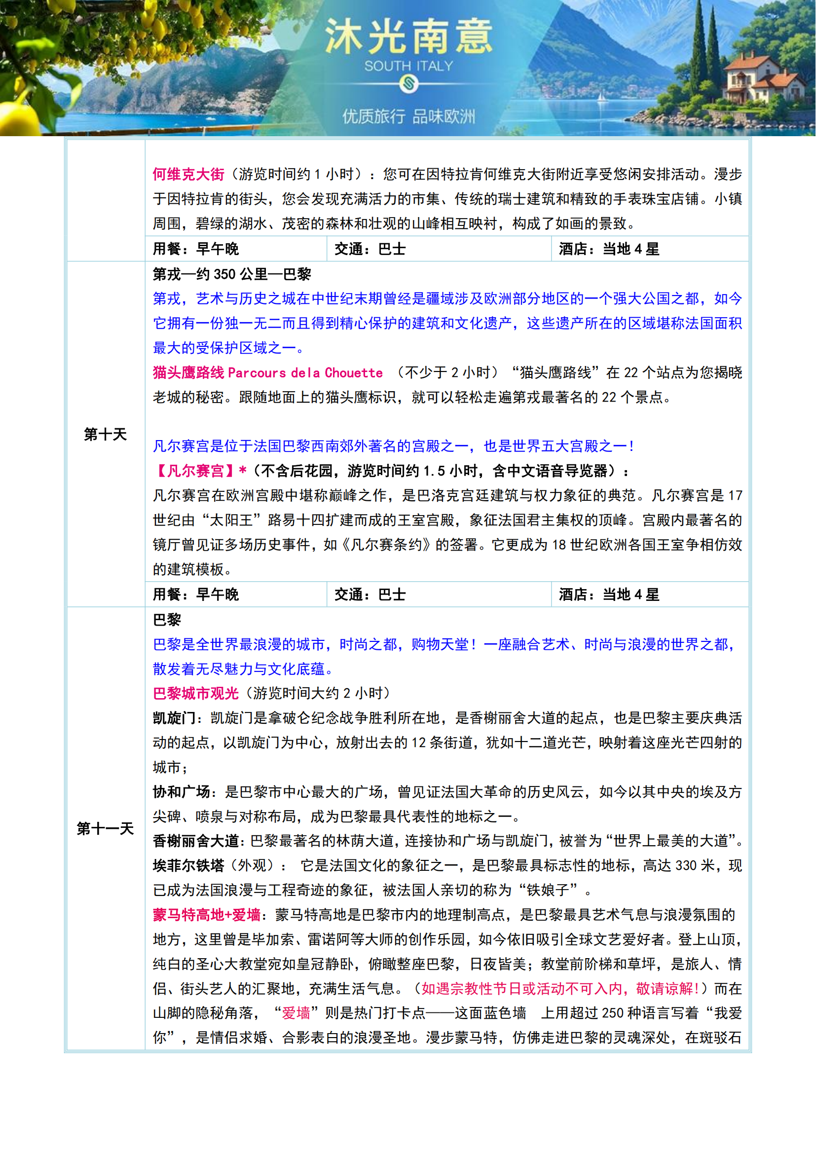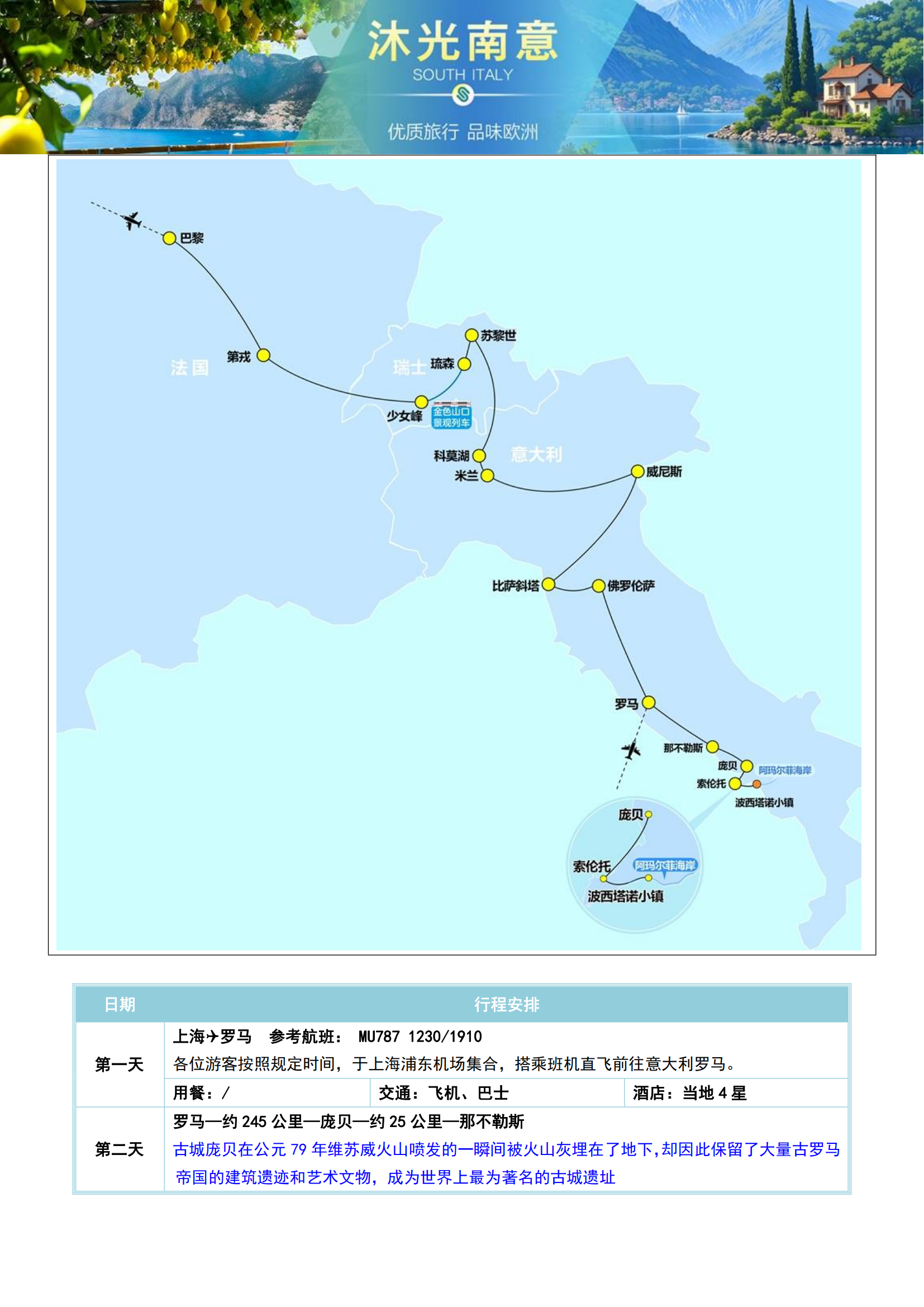 【2026年1-3月沐光南意】法国+意大利+瑞士11晚13日(全程含餐+庄园酒店+索伦托+阿玛尔菲+波西塔诺MU)SW