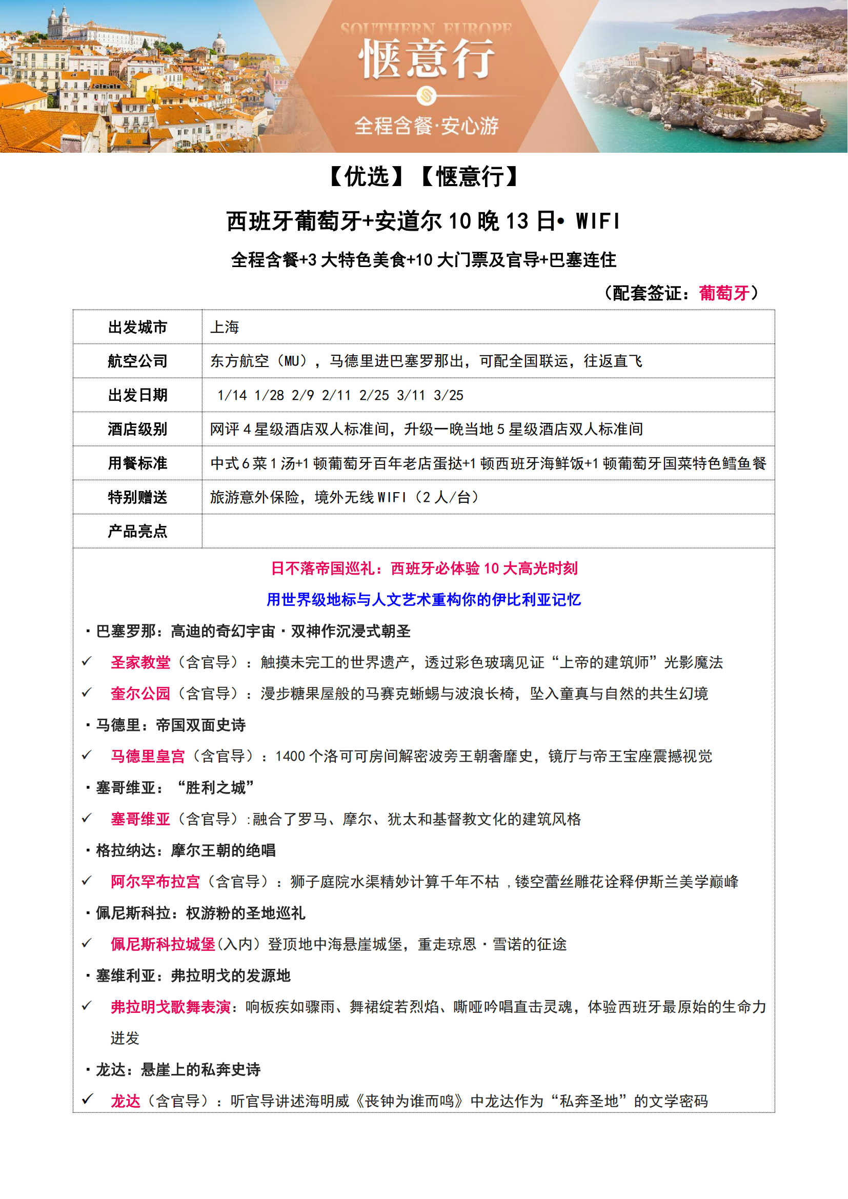 【2026年1-3月含春节惬意行】西班牙葡萄牙+安道尔13日(全程含餐+3大特色美食+10大门票及官导+巴塞连住)SW