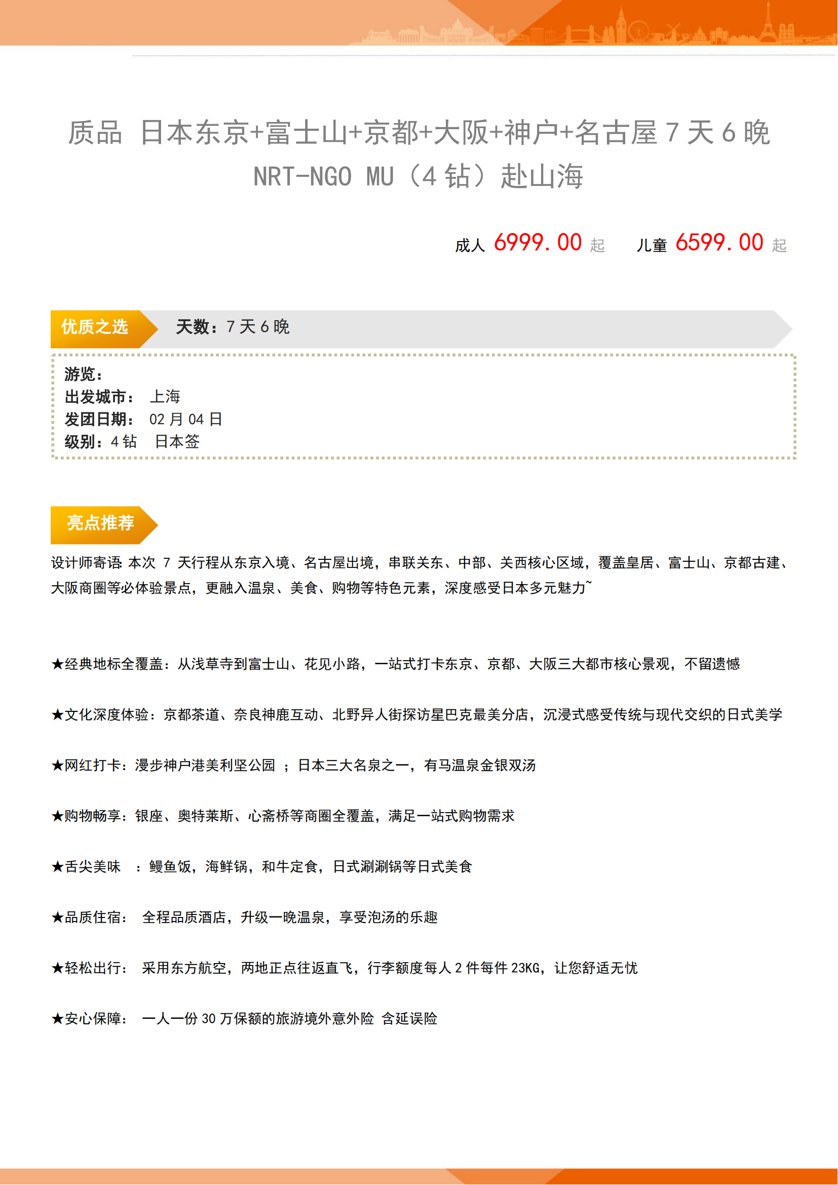 【2月+春节】4钻质品 赴山海-日本 东京+富士山+京都+大阪+神户+名古屋 6晚7日 FJY