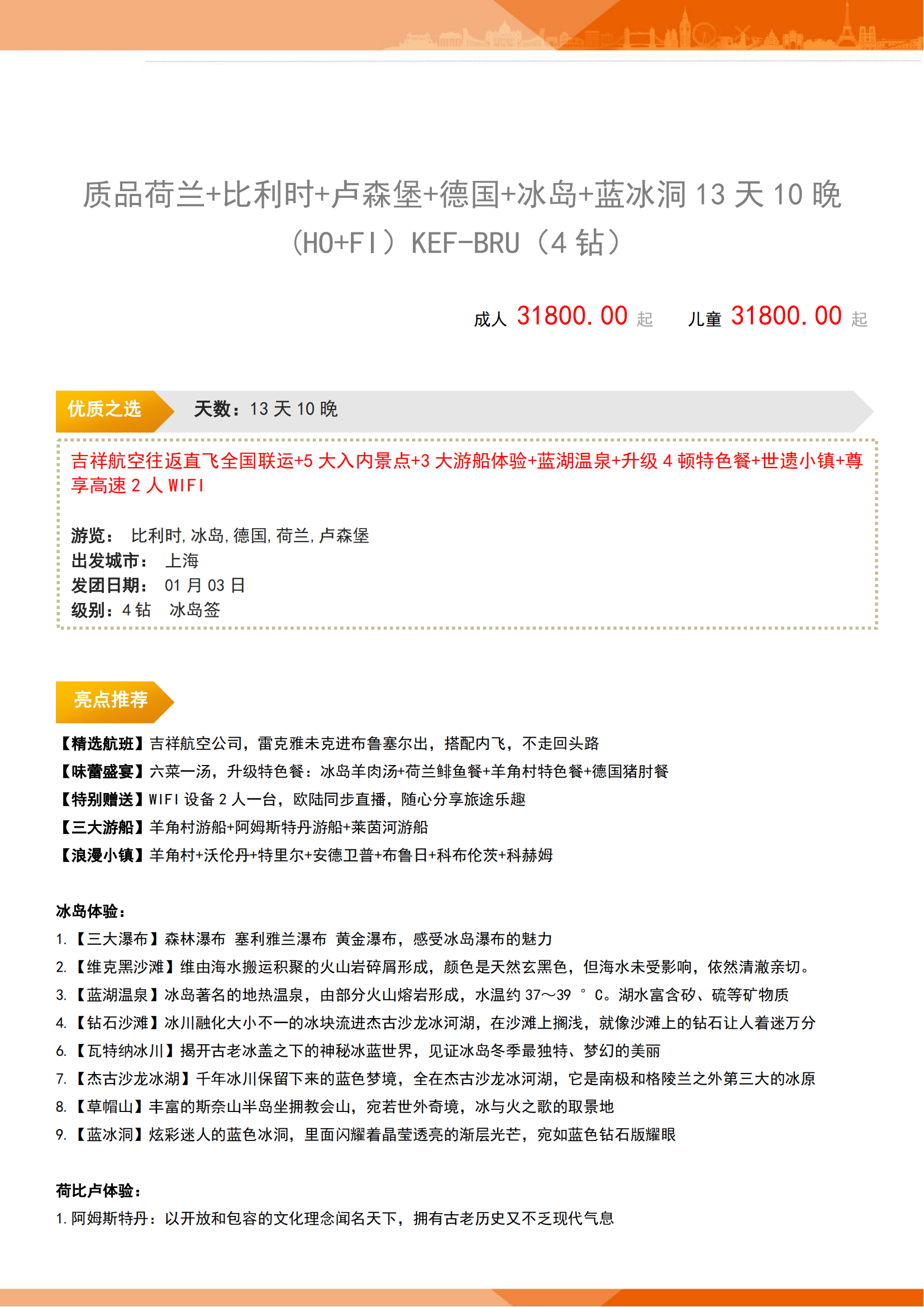 【12-1月】4钻质品-荷兰 比利时 卢森堡 德国+冰岛 10晚13日 FJY