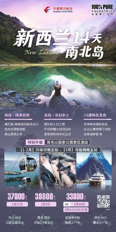 【1-3月】新西兰 南北岛 14日-皇后镇天空缆车 凯库拉观鲸 米佛峡湾 库克山艾格顿 高山火车-住库克山景区酒店 SLJ