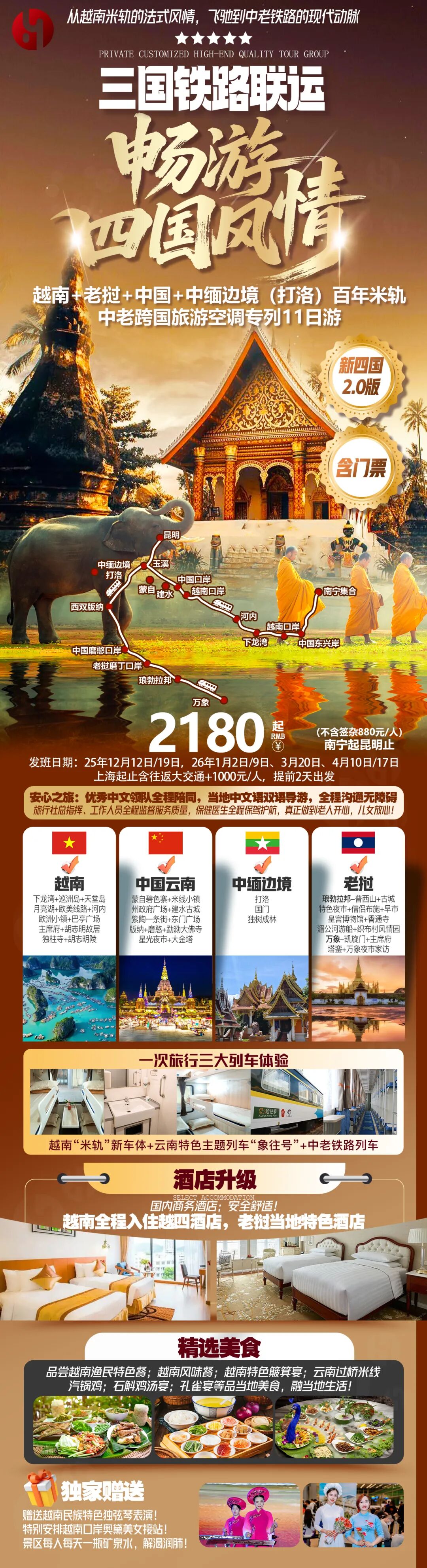玉溪-琅勃拉邦;万象-版纳-昆明段:“象往号”中老跨国旅游专列火车卧铺6/4人间;