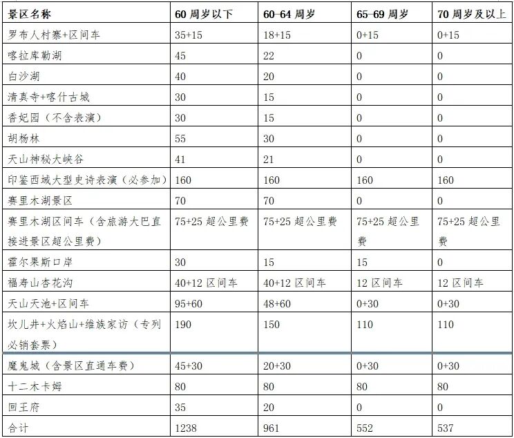 8、门票:不含门票。根据各地景区、景点对不同年龄段老年游客的优惠政策,我们把各景区不同年龄段的收费标准列表如下,请各位老年朋友统一在专列上凭借本人身份证上的实际年龄把对应的门票费用交给全陪导游。旅游途中如因身体原因或其他特殊情况,没有参观的景点门票或景区小交通费用在返程专列上由全陪退还。(表格所列门票价格和政策仅供参考,以当天、当地旅游景区政策为准,费用多退少补!)