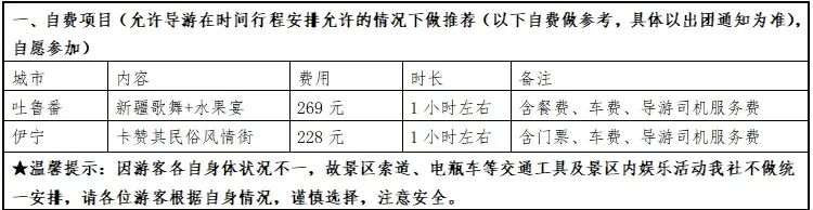 自费项目说明:1、上述安排是为了丰富旅游者的娱乐活动,游客自愿选择;