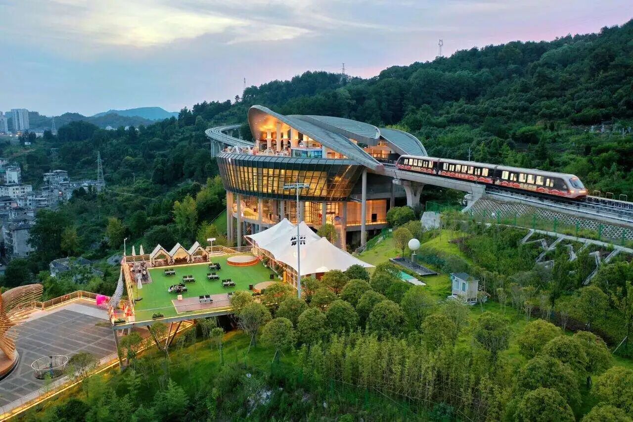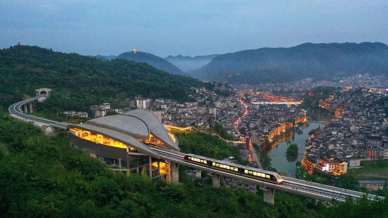 后乘坐磁悬浮直达【凤凰之眼·揽胜站】车站的整体造型酷似风凰眼,站点位置为俯瞰沱江和古城的最佳位置,车站设计三层宽敞的观景平台,游客可以置身车站观景、与风凰古城合影,居高临下的视角,感受沈从文笔下别样的“流水、渡船、人家”;