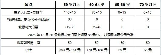 【门票一览】此次行程均未含门票,游客根据年龄自行购买门票(也可请导游帮忙购买)。 以下是此次行程各景点门票收费明细(仅供参考),所有门票价格均按当地景点公布价格执行为准。