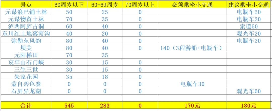 1、门票及景区小交通列表:行程中不含所有门票与景交,敬请当地根据年龄自愿自选自理,自行现场购买或由导游代办,年龄精确到年/月/日核算