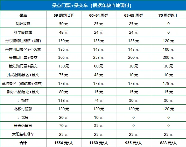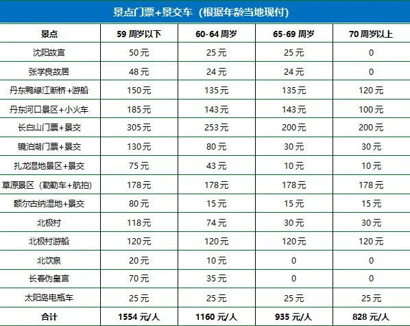 🚂【圆梦大东北】双卧15日游 ✨ 全景覆盖精华 不留旅途遗憾 🌍 15 日环游大东北 圆梦边境之旅 🚞 双卧舒适出行 专车专导护航 🍲 十大特色美食 舌尖味蕾盛宴 🏯 沈阳故宫访古 张学良旧居寻踪 🌊 鸭绿江断桥凭吊 安东老街寻味 ⛰️ 长白山天池揽胜 聚龙温泉暖心 💧 镜泊湖光山色 吊水楼瀑布壮观 🏰 哈尔滨异域风 中央大街漫步 🦅 扎龙湿地观鹤 草原策马奔腾 🌿 额尔古纳湿地 呼吸天然氧吧 🌌 北极村寻最北 界江游船赏俄景 ⛰️ 五大连池探秘 北饮泉品矿泉 圆梦大东北 My Trip in 2026 东 北 沈阳 | 丹东 | 长白山 | 镜泊湖 | 横道河子 | 哈尔滨 | 齐齐哈尔扎龙湿地 呼伦贝尔 | 海拉尔 | 黑山头 | 额尔古纳 | 边防公路 | 满洲里 | 根河 | 满归 北极村 | 漠河 | 加格达奇 | 五大连池 双卧15日游 5月4日首发班 👍王牌产品,四省联动,深度北国 👍从穿越大兴安岭,到风情满洲里 👍特色美食探秘,升级十大特色餐 👍全程甄选当地舒适型酒店 双卧开班日期🔄销售价格 ABOUT this NOVEL 开班日期 成人 儿童 房差 5月4/8/11/15/日 ¥2980 ¥2480 ¥600 5月18/22/25/29日 ¥2980 ¥2480 ¥600 6月1/3/5/8日 ¥3080 ¥2580 ¥650 6月10/12/15日 ¥3280 ¥2780 ¥850 6月17/19/22日 ¥3280 ¥2780 ¥850 6月24/26/29日 ¥3280 ¥2780 ¥850 7月1/3日 ¥3280 ¥2780 ¥850 7月6/8/10/13/15日 ¥3580 ¥2980 ¥1150 7月17/20/22日 ¥3580 ¥2980 ¥1150 7月24/27/29/31日 ¥3580 ¥2980 ¥1150 8月3/5/7/10日 ¥3580 ¥2980 ¥1150 8月12/14/17/19日 ¥3580 ¥2980 ¥1150 8月21/24/26/28日 ¥3280 ¥2780 ¥750 9月2/4/7/9/11/14日 ¥3080 ¥2580 ¥750 9月16/18/21/23日 ¥3080 ¥2580 ¥750 9月25/28/30日 ¥3380 ¥2880 ¥850 10月2日 ¥3380 ¥2880 ¥850 10月5/7/9日 ¥2980 ¥2480 ¥600 / 双卧往返🔄火车班次 Train Reference Number 上海站-沈阳北站 Z516次(13:32-10:30+1) 长春站-上海站 Z518次(15:50-13:20+1)