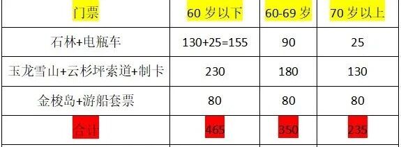 70岁周岁以上:石林电瓶车25元+玉龙雪山云杉坪索道+制卡130元+金梭岛门票+游船套票80元=235元