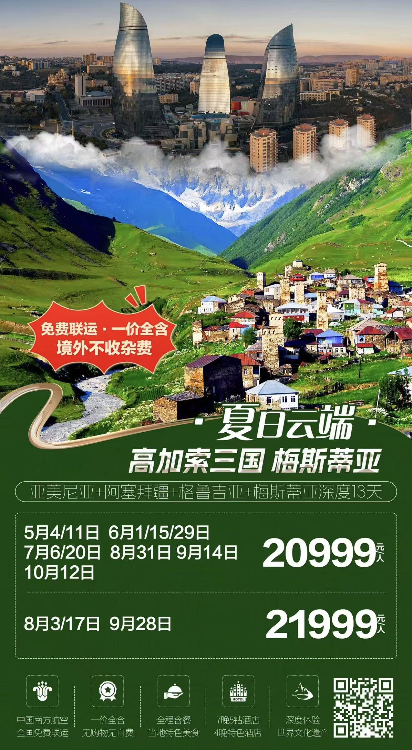 【5-10月CZ夏日云端高加索】亚美尼亚+阿塞拜疆+格鲁吉亚+梅斯蒂亚深度13天(一价全含+无购物无自费+7晚5钻酒店+4晚特色酒店)FJY