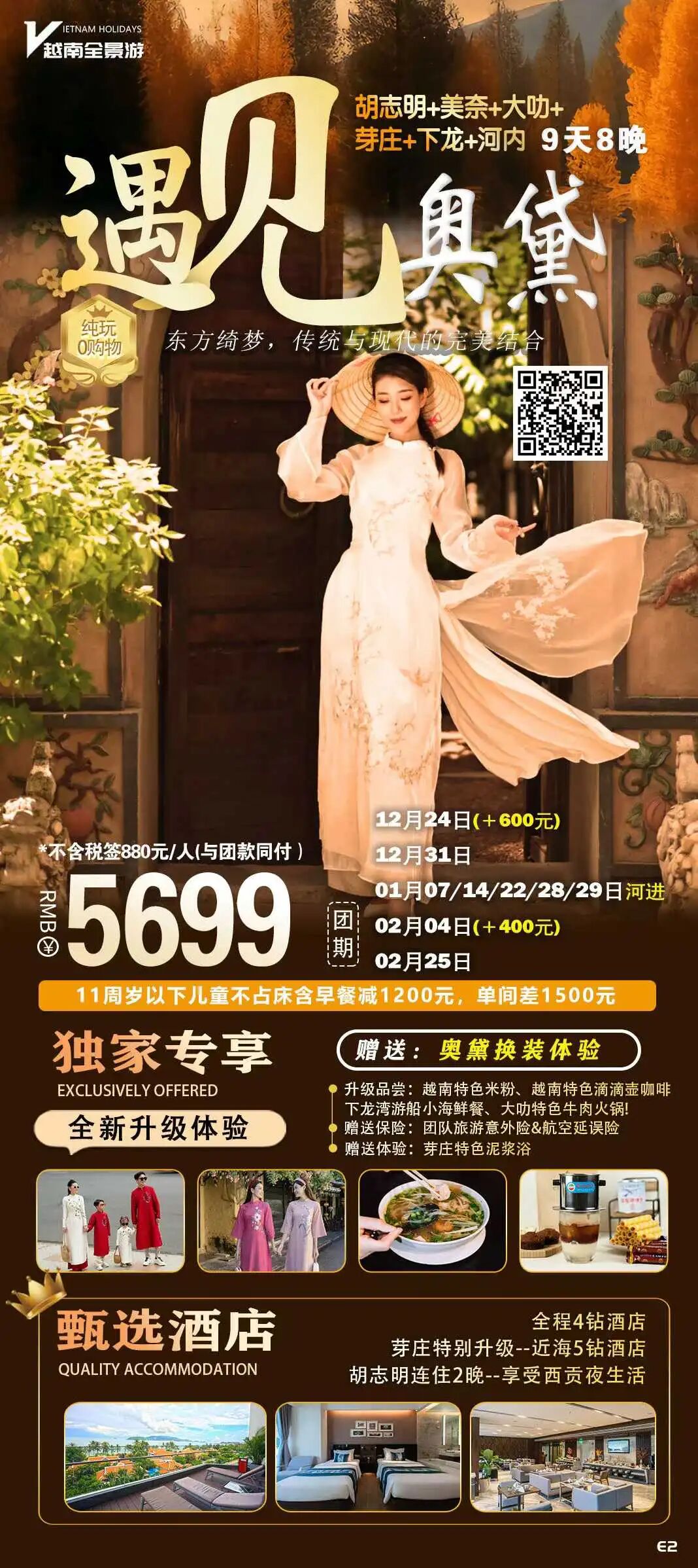 <遇见奥黛-(河进胡出)>胡志明、美奈、大叻、芽庄、下龙、河内9日纯玩团0购物 - HY