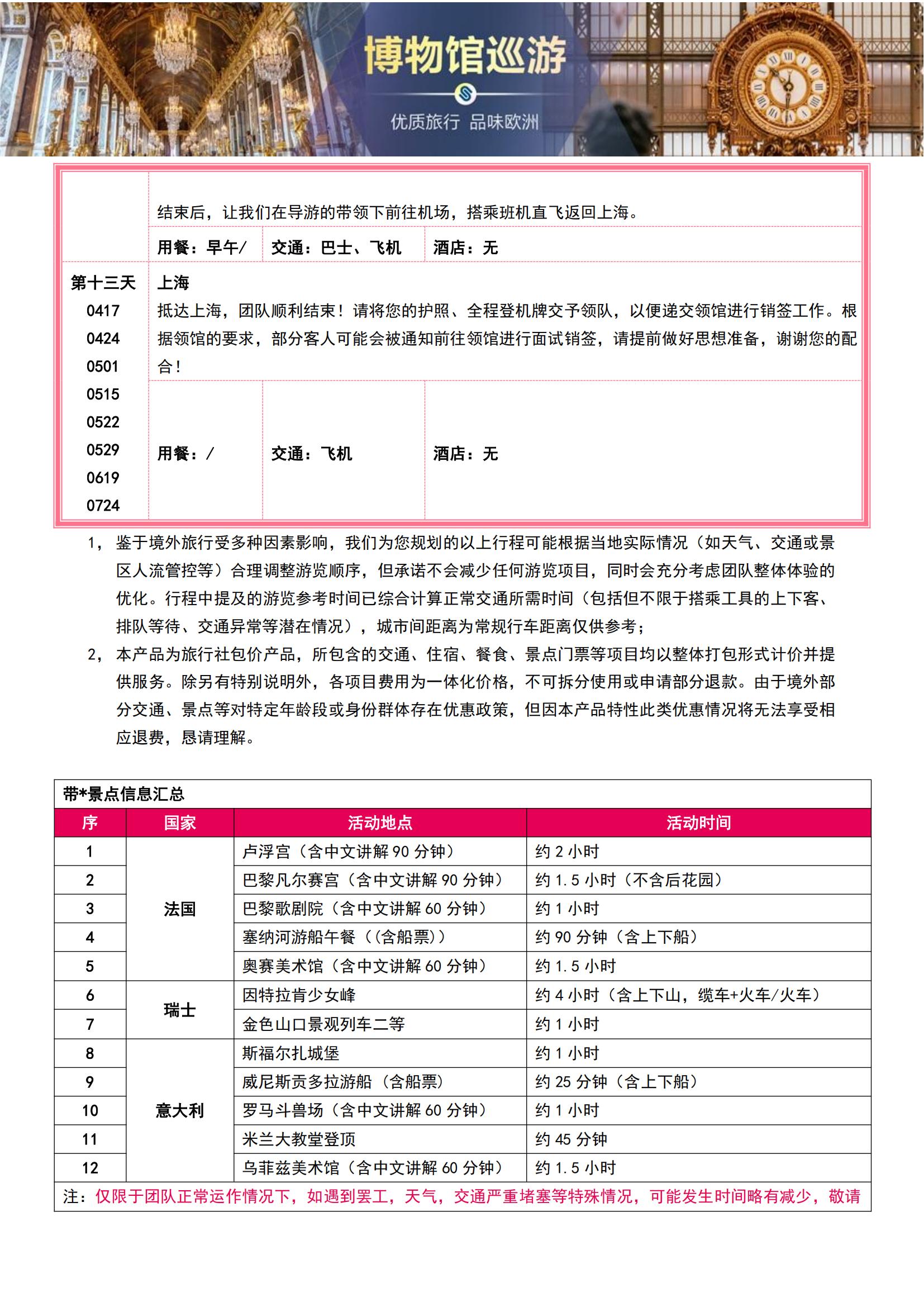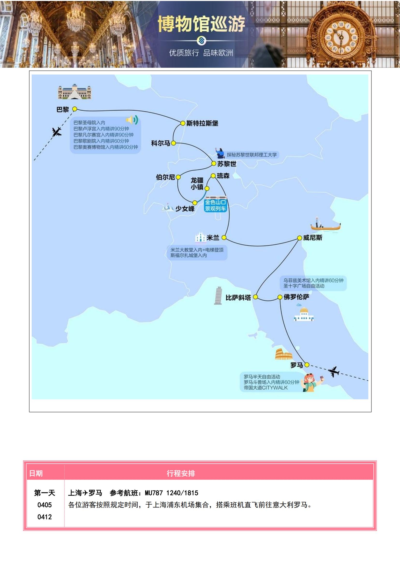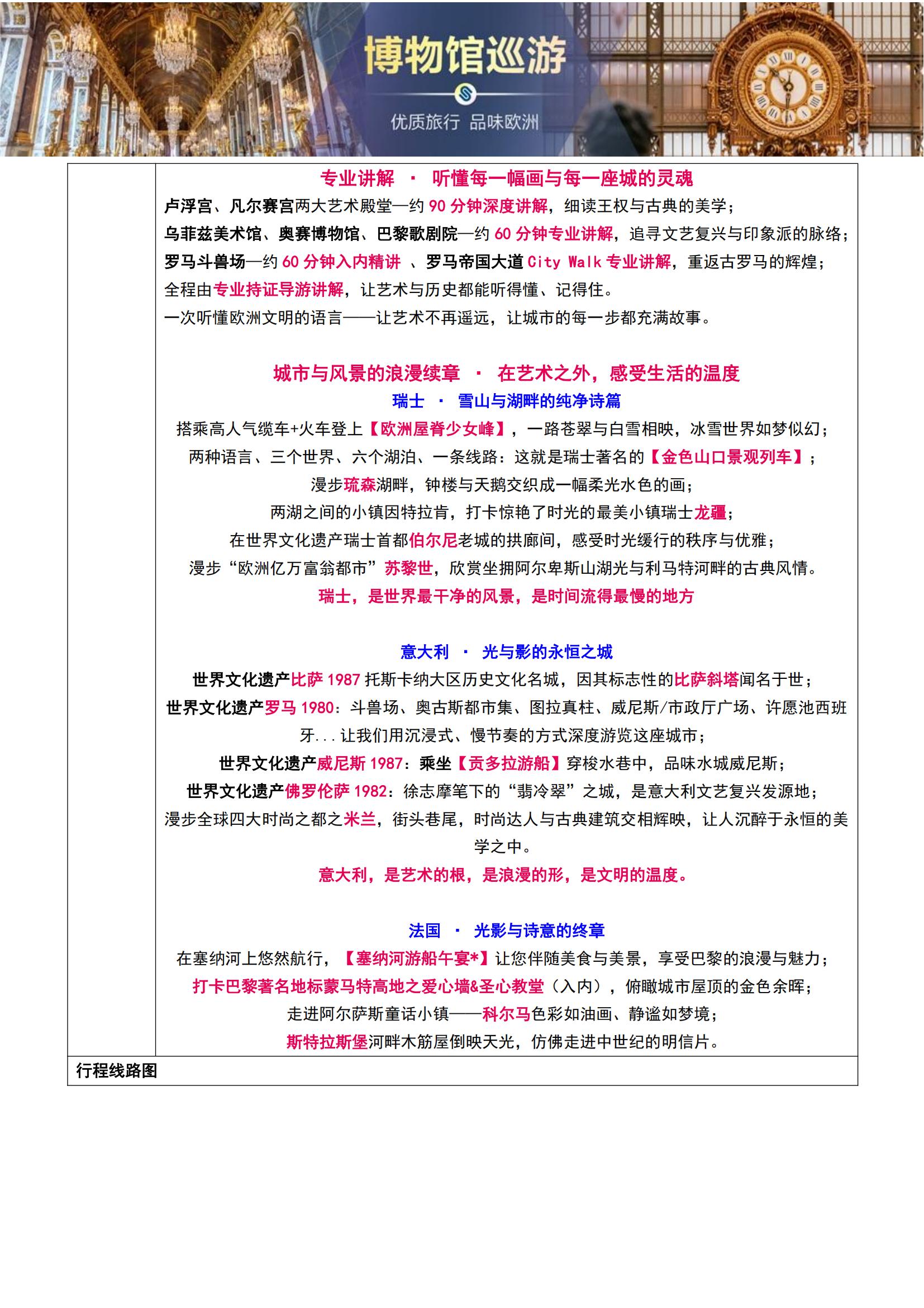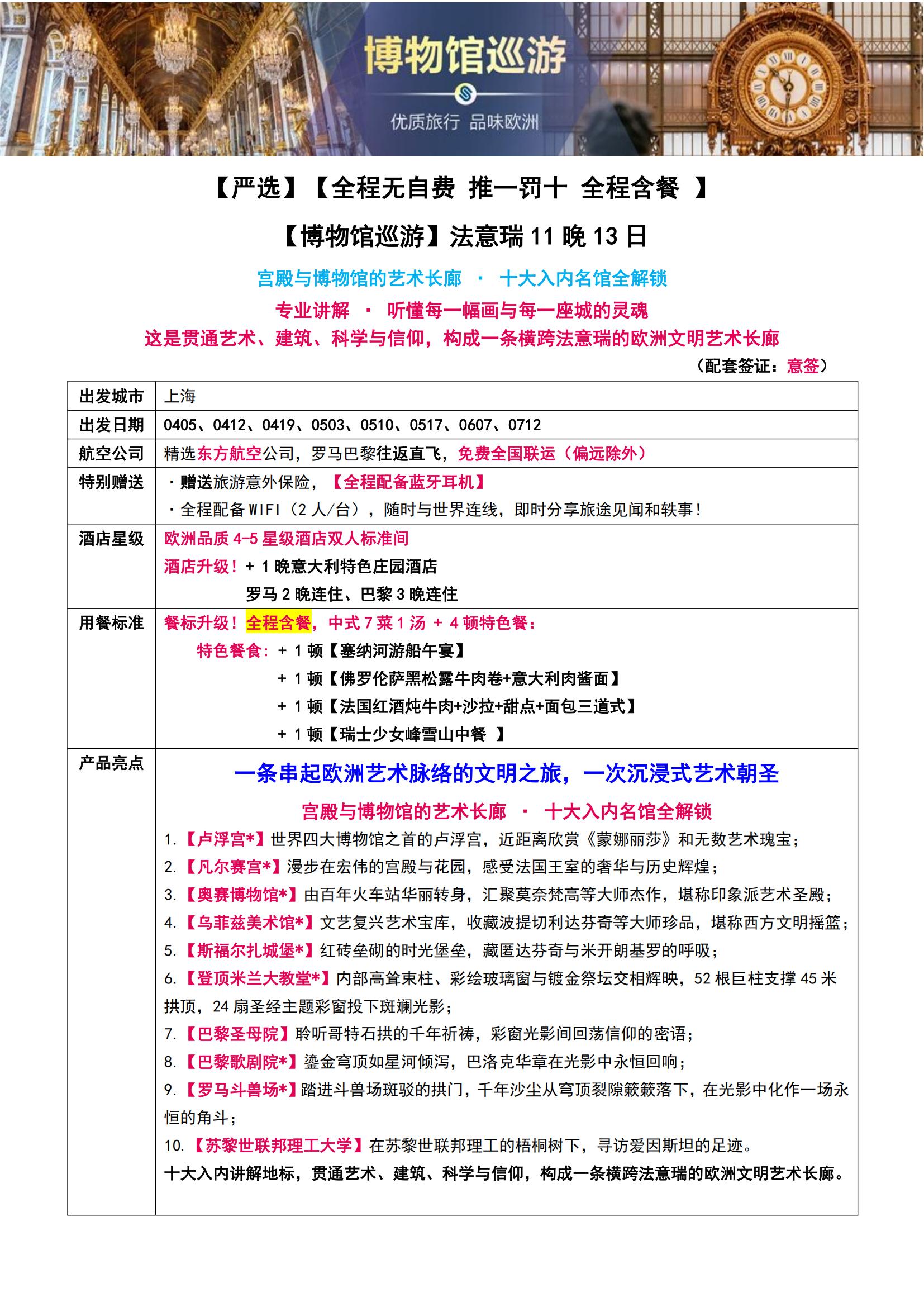 • 【4-7月博物馆巡游】法意瑞11晚13日(全程含餐+宫殿与博物馆的艺术长廊 +十大入内名馆全解锁专业讲解MU)SW
