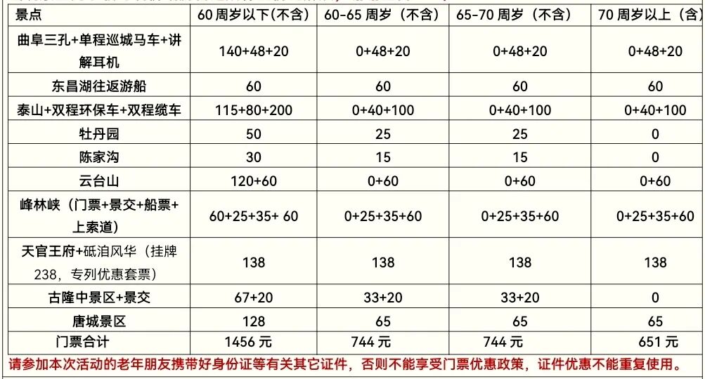 根据各地景区、景点对不同年龄段老年游客的优惠政策,我们把各景区不同年龄段的收费标准列表如下,请各位老年朋友统一在专列上凭借本人身份证上的实际年龄把对应的门票费用交给全陪导游。旅游途中如因身体原因或其他特殊情况,没有参观的景点门票或景区小交通费用在返程专列上由全陪退还(已提前预约门票的除外)。(表格所列门票价格和政策仅供参考、以实际抵达当地旅游景区政策为准!)(请各收客合作社不要提前收取门票费用,以免出现景区门票临时调价给游客造成补差价的麻烦,谢谢配合!!)