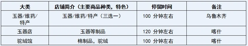 5、购物:乌鲁木齐玉器博览馆、喀什玉器博览馆、驼绒馆;