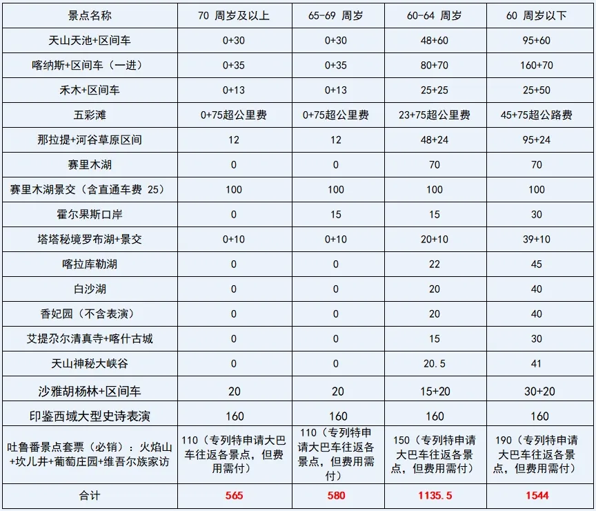 6、根据各地景区、景点对不同年龄段老年游客的优惠政策,我们把各景区不同年龄段的收费标准列表如下,请各位老年朋友统一在专列上凭借本人身份证上的实际年龄把对应的门票费用交给全陪导游。旅游途中如因身体原因或其他特殊情况,没有参观的景点门票或景区小交通费用在返程专列上由全陪退还(已提前预约门票的除外)。(表格所列门票价格和政策仅供参考、以实际抵达当地旅游景区政策为准!)(请各收客合作社不要提前收取门票费用,以免出现景区门票临时调价给游客造成补差价的麻烦,谢谢配合!!)