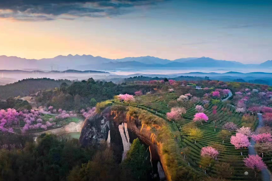 ◈【高椅岭樱花茶场乐园】位于湖南省郴州市苏仙区桥口镇与资兴市交界处,以神奇丹霞地貌为核心,在种植的茶园基础上并栽种了大型的各种樱花树约4000株。其中主要品种包括红粉佳人、中国红、八重樱等观赏品种。和其他樱花不一样,这个茶园樱花香气十足,和茶树的味道混合在一起,形成“神奇丹霞景,茶绿樱花红”的震撼视觉效果,近年已经成为各地区市民踏青赏花的网红打卡地。也是由郴州市高椅岭旅游投资有限公司历经6年时间斥巨资打造的“抬头观花,低头采茶”的樱茶文化园。