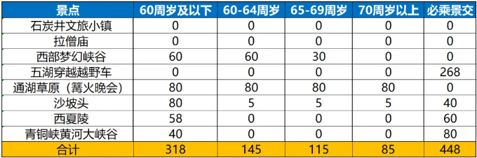 费用包含 FEI YONG BAO HAN 【交通】上海-银川-上海往返经济舱机票含行李(手提7KG+托运20KG)不含机建+燃油140元/人,随团费一同支付(根据航司最新政策,如遇政策调整,以实际出票为准,多退少补)切位机票一经确认不得退票、改签,请仔细核对客人信息,退团机票损失1000元/张; 【住宿】全程5晚酒店双标间(目的地城市非一线发达城市,接待能力有限,我社安排当地同级标准中较好酒店,游客报名前可根据我社提供参考酒店名称提前做了解,全程无三人间或加床,单人报名请补足房差); 【参考酒店】 银川(四钻)*2晚:溪谷诺富特、逸扉酒店、建国璞隐、万豪万枫或同级 乌海(四钻)*1晚:乌海世纪元酒店、金海湾国际酒店、华力建国或同级 左旗(三钻)*1晚:凯利亚德、朗威酒店、浩鑫智选、金惠酒店、君昂星光酒店或同级 中卫(四钻)*1晚:文脉湖景、宏伟百谦、优派莱斯或同级 【用餐】全程含5早6正餐(早餐为酒店赠送;如因客人自身原因不用,费用无法退还); 【用车】当地2+1VIP陆地头等舱 【导服】当地优秀导游服务(自由活动,飞机上无导游陪同) 【儿童】儿童含机票、半餐、旅游车、导游服务(不包含:床位、酒店早餐),其它标准同成人 【温馨提示】 1.该产品报价为综合优惠价格,已享受景区扶持、老年优惠政策,参团时必须持身份证配合购票; 2.持特殊证件或如遇不可抗力因素景点不营业,需要退门票时则按旅行社折扣价当地退现;(赠送景点不参加不退费用); 3.我社在不减少行程内容和接待标准的前提下可以调整行程顺序。 费用不含 FEI YONG BU HAN 1. 全程自然单房差(全程无三人间或加床,单人报名请补足房差,三人报名可选择入住一间标间退一房差,第三人早餐需自理); 2. 机建+燃油140元/人,报名时一同支付(根据航司最新政策,如遇政策调整,实际以出票为准,多退少补); 3. 门票年龄差价(随团费支付): 60周岁以下补:318+448=766元 60-64周岁补 :145+448=593元 60-69周岁补:115+448=563元 70周岁及以上补:85+448=533元 4. 因交通延阻、罢工、天气、飞机机器故障、航班取消或更改时间等不可抗力原因所引致的额外费用; 5. 酒店内洗衣、理发、电话、传真、收费电视、饮品、烟酒等个人消费; 6. 旅游人身意外保险及航空意外险(建议旅游者购买); 7. 自由活动期间的餐食费和交通费; 8. 因旅游者违约、自身过错、自身疾病导致的人身财产损失而额外支付的费用; 9. 当地参加的自费以及“费用包含”中不包含的其他项目; *注:以上图片来源网络,如有侵权请告知,我社立刻调整处理! *注:以上所有图片仅供参考,具体请以实际为准!