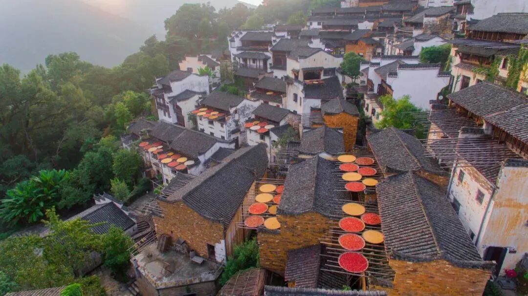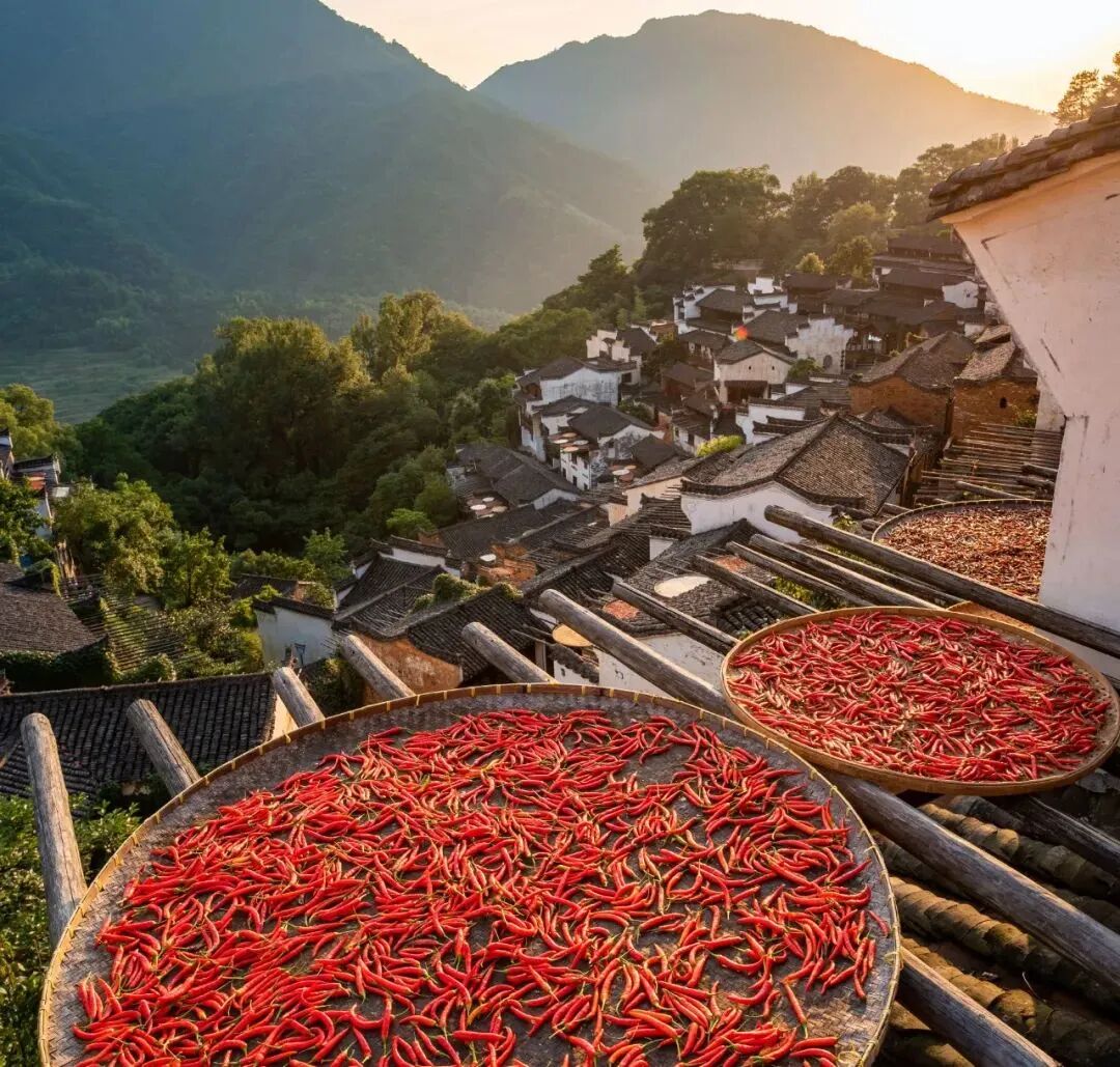 婺源篁岭的top1当然是推出窗外的晒盘咯!晒盘上这高饱和度的红色,满满的都是晒秋大妈对于美好生活的憧憬,好像在说:接下来的每一天大家都要红红火火哦!