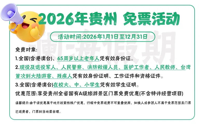 因贵州气候湿润,景区道路多为山地石板路,容易道路湿滑。建议75周岁以下的客人购买专门的游客人身意外险10元/人/天,合计50元/人,75周岁以上的长者,必须购买专门的游客人身意外险20元/人/天,合计100元/人,可在签订合约时,交由工作人员代买。