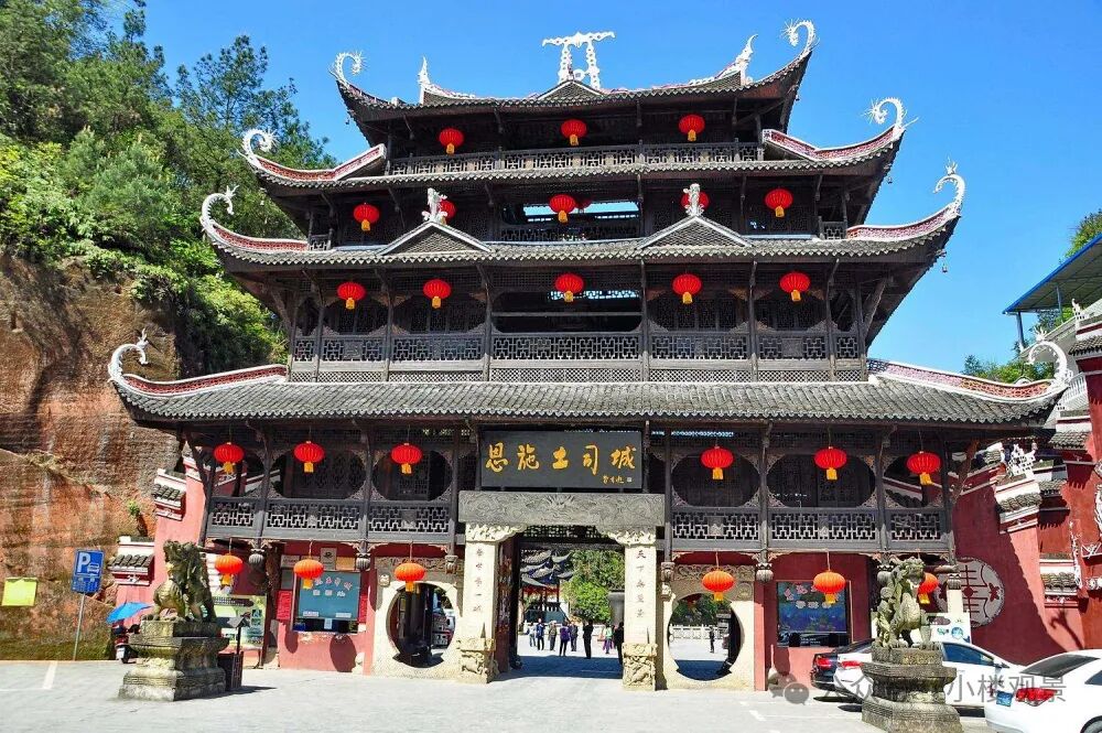游玩结束后返回恩施市区;后乘车前往【恩施土司城】(车约30分钟,游览时间约1.5小时)土司城是目前国内规模最大、风格独特、景观壮丽的集土家族、苗族和侗族建筑艺术于一体的仿古建筑群落。游览观光的景点景观甚多,主要包括有九进堂、土家族钟楼、侗族鼓楼、侗族风雨桥、土司城墙、铁索软桥、白虎雕像等。