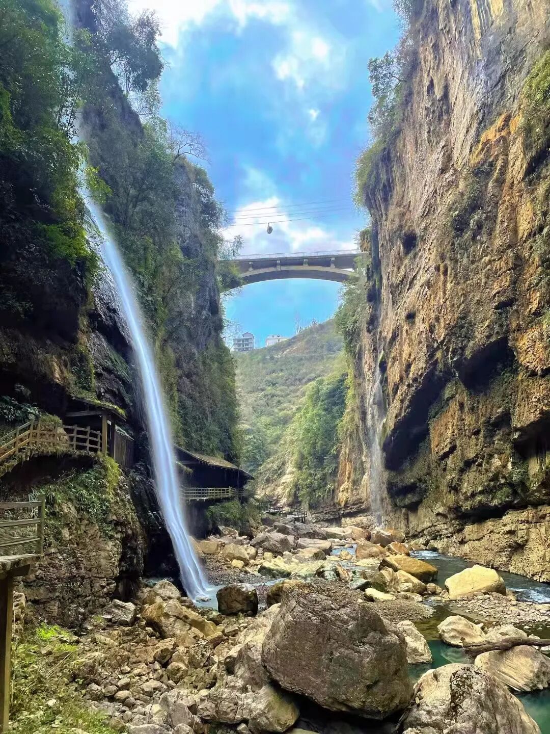 后游览【云龙河地缝】(游览时间约1.5小时),地缝位于恩施大峡谷山脚,全长近20公里,最深处近100米,地缝两侧绝壁陡峭,一道道瀑布飞泻直下,水质清澈见底,在正午阳光下呈现出一弯弯彩虹,斑斑阳光洒入缝中,以险、俊、奇、幽的自然景象展现在人们眼前。