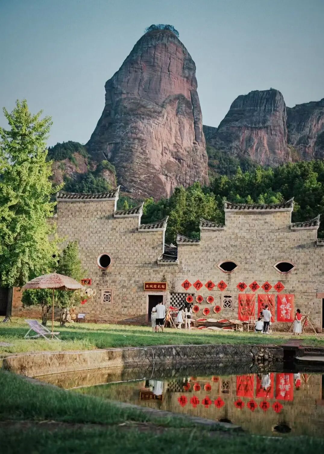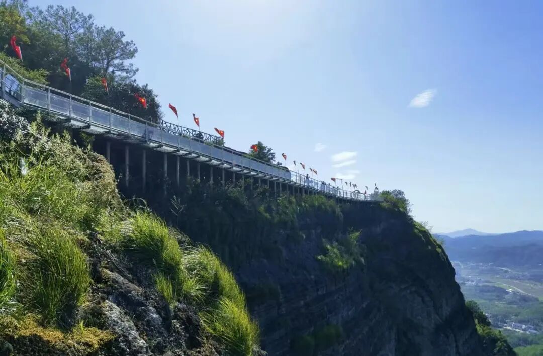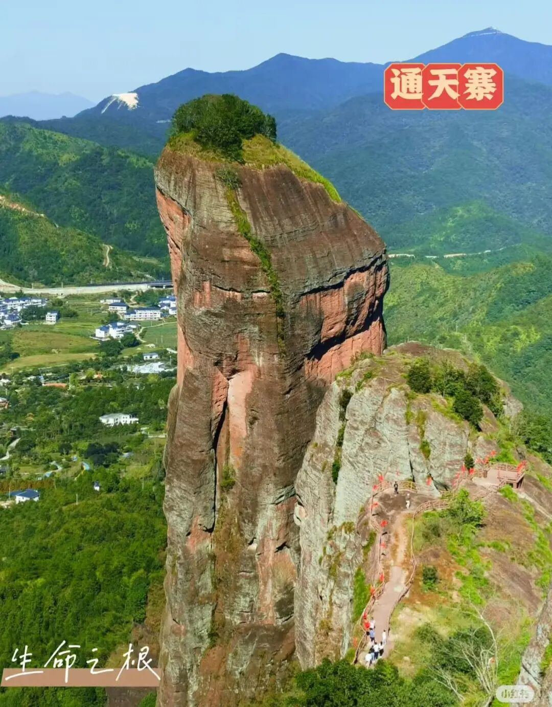 到达山顶走在【高空玻璃栈道】上俯瞰大畲古村,满满的荷花尽收眼底。丹霞地貌-特指在红色砂岩石地区,由于地质运动造成岩层抬升、裂缝,地表水成千上万年切割侵蚀,形成遍布陡崖、石柱的独特地表形态,由于砂岩中含有大量的三价铁,便形成了色若渥丹,灿若明霞的视觉特征。