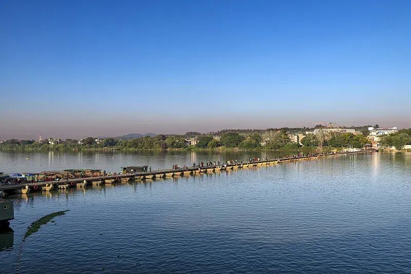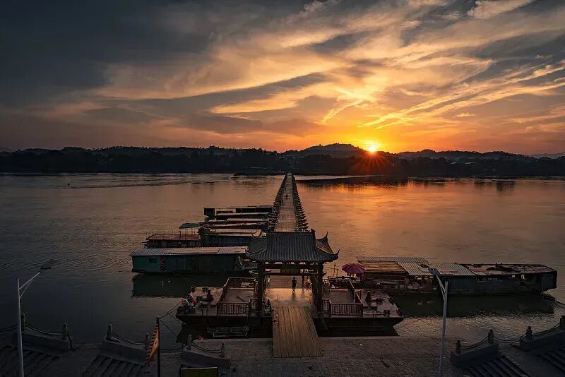 【古浮桥】:由100多只小舟板并束相连而成的 400米古桥;有兴趣的游客可以自由去夜逛宋城,梦回宋朝街景、四贤坊外迎宾仕女、赣州十八坊特色美食、状元还乡…在江西省赣州市江南宋城历史文化旅游区,一幅清明上河图般的繁华场景,让游客仿佛穿越千年,切身感受到宋城文化的魅力。