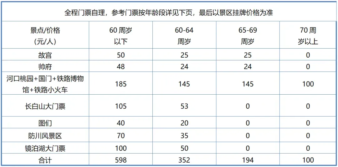 4.【门票】:全程门票自理,请根据出游人实际年龄现付,价格参考景点门票表(后附)。