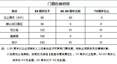 6. 门票全程不含门票,根据各景点对不同年龄段老年游客的优惠政策,各景区不同年龄段的收费标准列表如下(以下门票仅供参考,届时以景区实际公布为准),门票费用当地现付导游。此产品不接受80岁以上贵宾报名,敬请谅解。