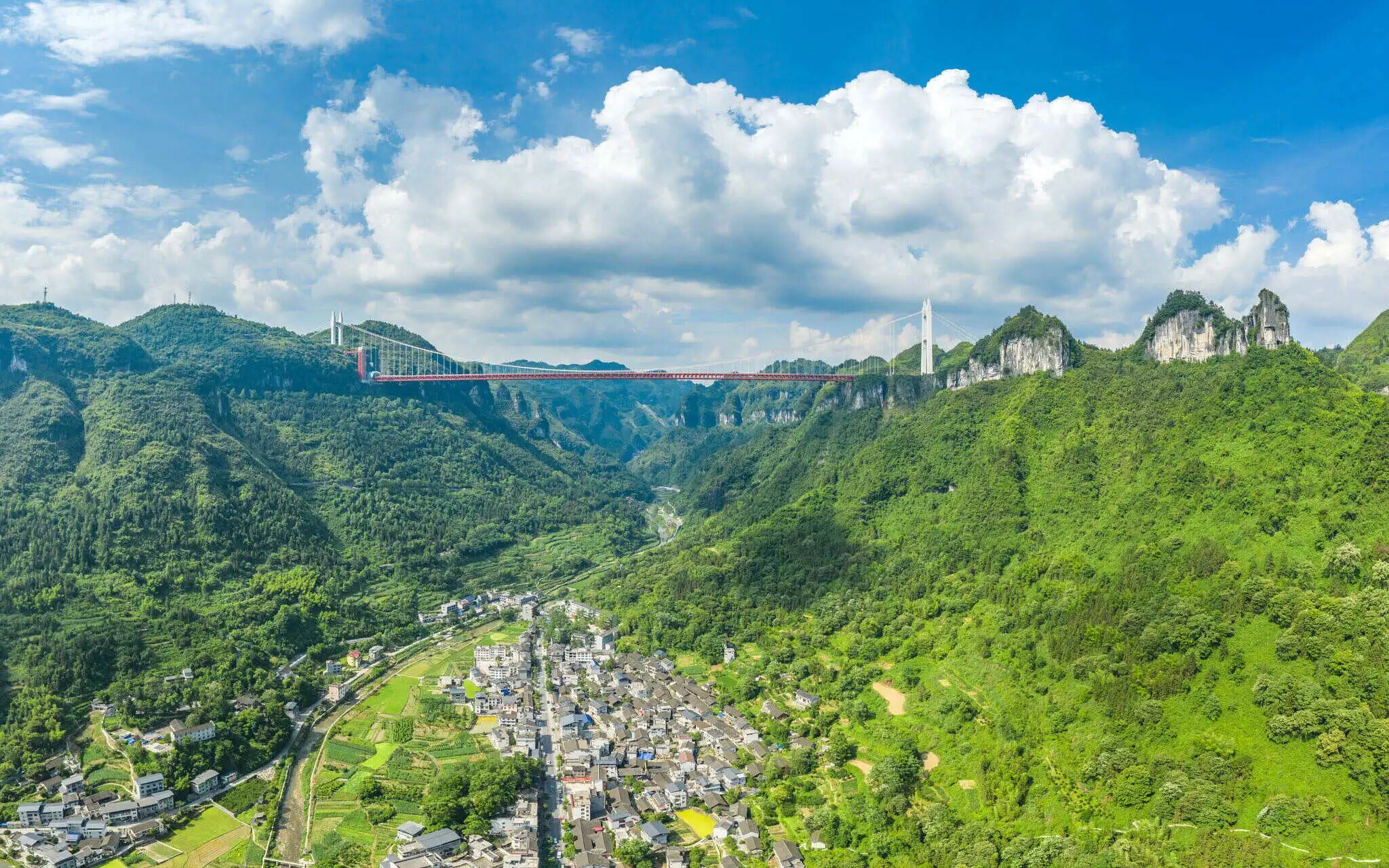 矮寨大桥横亘于矮寨峡谷之颠,是目前世界上峡谷间跨度较大的钢桁梁悬索桥,大桥跨径1176米,距离峡谷底部的高度为355米,2007年10月开始修建,2012年3月建成通车。