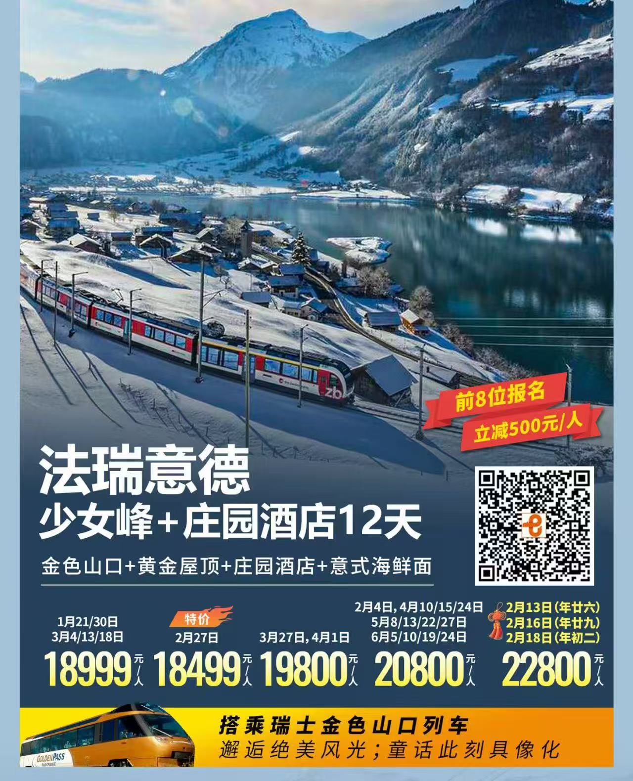 【2026年2-6月质品】法国+瑞士+意大利+德国+少女峰+金色山口+庄园酒店12天9 晚(MU)FJY